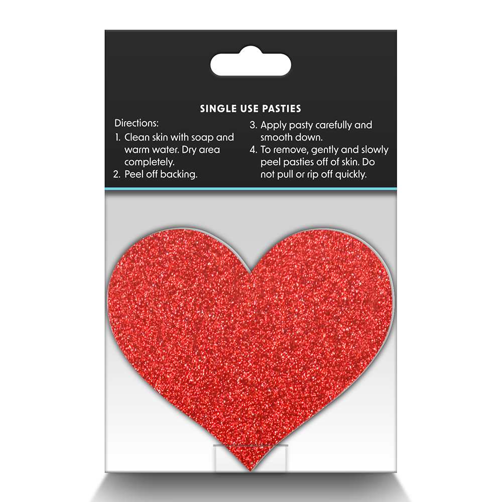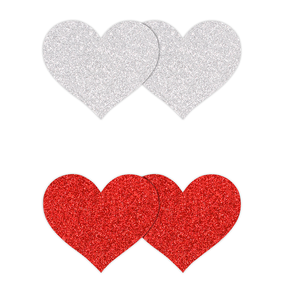 Add an alluring, romantic vibe to any lingerie look or rave outfit with the Glitter Heart Adhesive Nipple Pasties 2-Pack by Pretty Pasties!