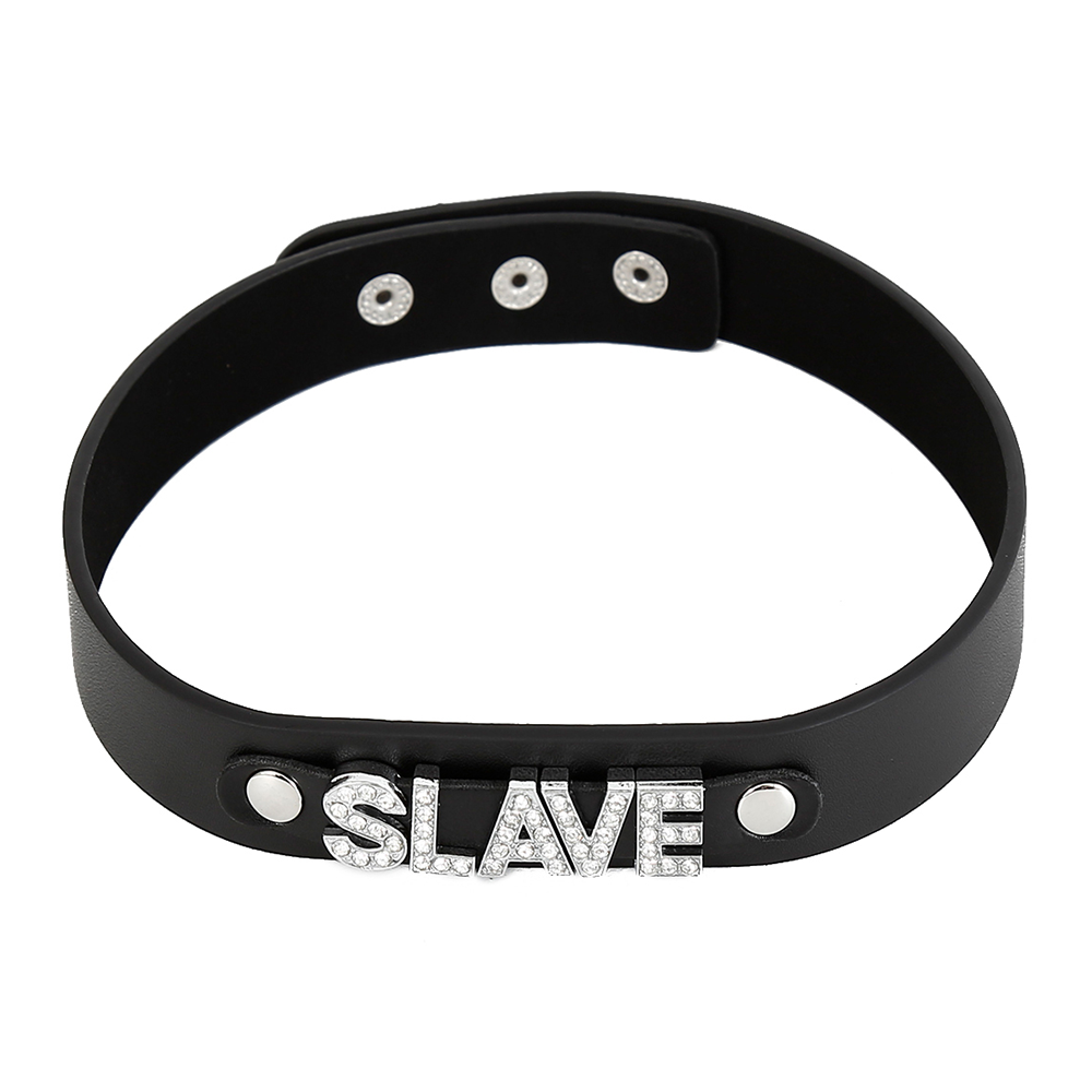 - Glittering rhinestones spell out SLAVE to proudly proclaim your lowly status