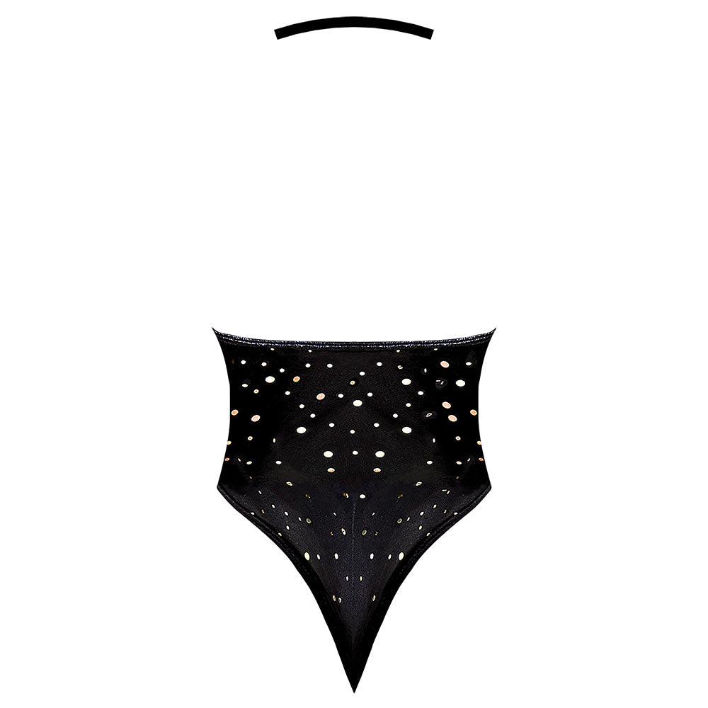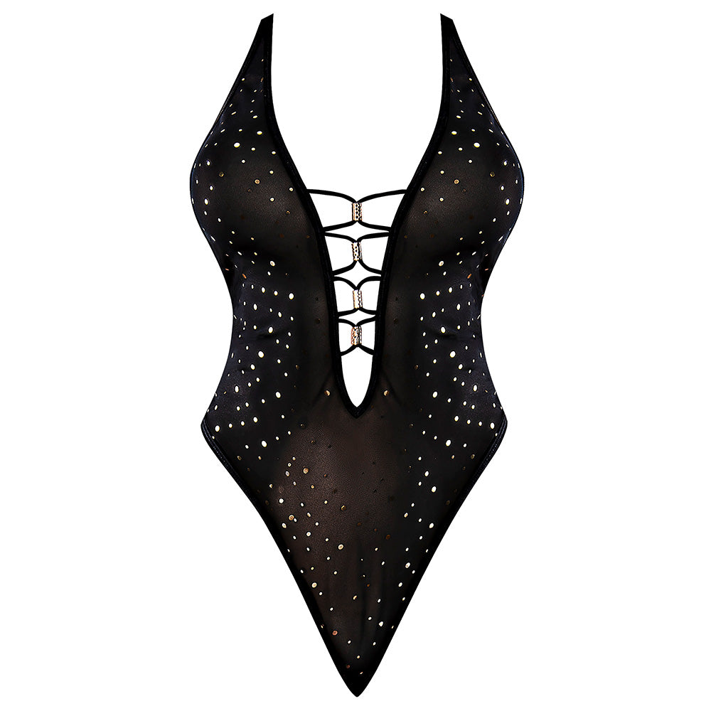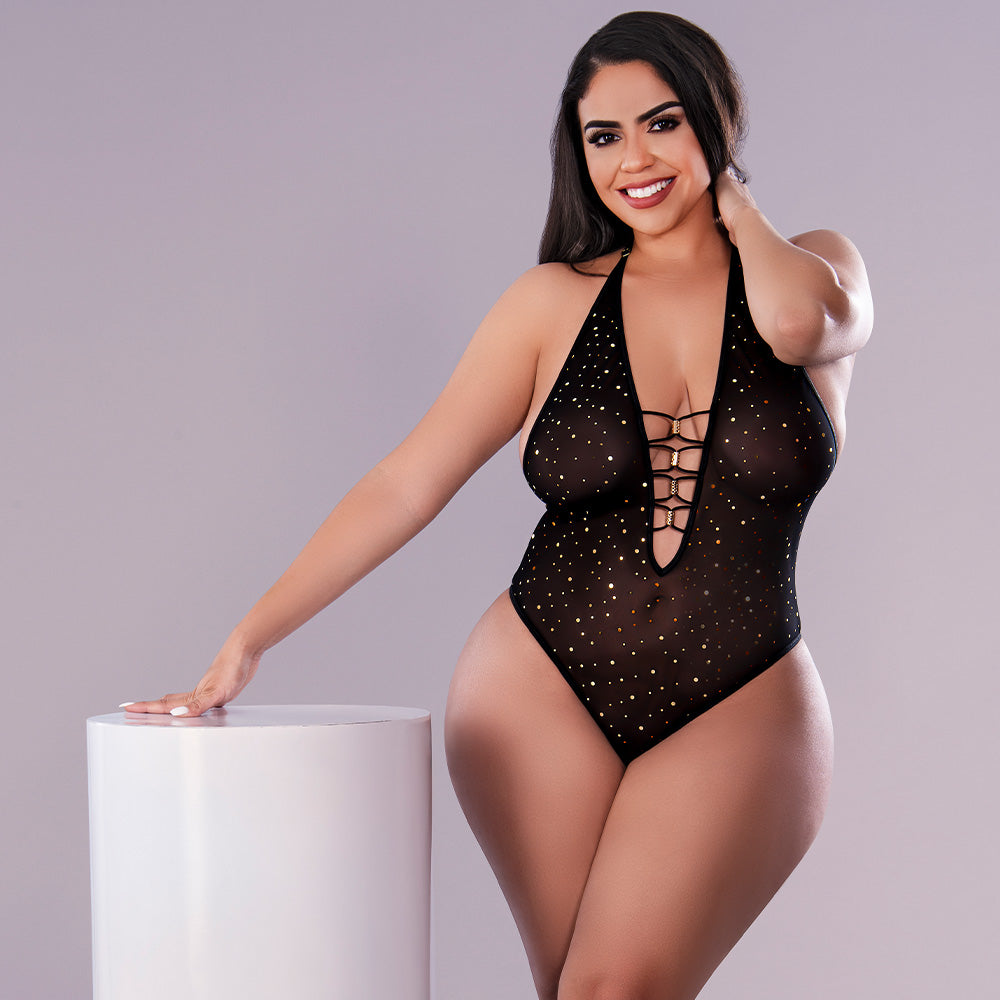 This stunning lingerie one-piece flatters your full figure with its stretchy sheer mesh that hugs your body and lets your skin peep through the transparent material while shiny gold sequins decorate your body like stars shimmering against the night sky. The plunging V-neck offers a generous view of your cleavage, complemented by a gold-beaded strappy woven detail that bridges the two sides of the teddy in luxurious style. The plunging design reaches up around the back of your neck, forming halter-style shoulder straps that combine with the low back to expose your entire back to the gaze and touch of a playmate as the two of you embrace. You'll feel their eyes devouring you as you strut your way towards them, the high-cut leg elongating your legs and making your hips look lovely and round — turn around and you'll treat them to the sight of the cheeky high-cut Brazilian-cut bottoms disappearing deliciously between your buns! Best of all, the snap-crotch closure allows for easy access to your intimate assets, meaning this sexy bodysuit can keep up when the moment starts heating up...