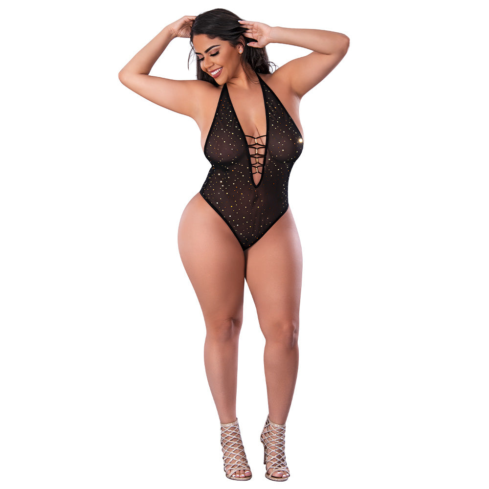 Shine bright like a diamond in the Plus-Size Plunging Low-Back Sequin Mesh Teddy from Exposed's® Glitz & Glam range!