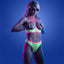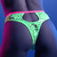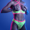 This cheeky lingerie set is made from glow-in-the-dark floral lace and transforms colours when activated in sunlight thanks to its UV-reactive properties. The underwired bra provides some support while the cupless design bares your breasts for the world to see! Contrasting elastic trim forms a cage strap halter detail, criss-crossing in the back to form X-shaped shoulder straps that you can adjust for your perfect fit. The cutout back reveals more skin and houses the hook-and-eye closure, making this set easy to get in and out of.