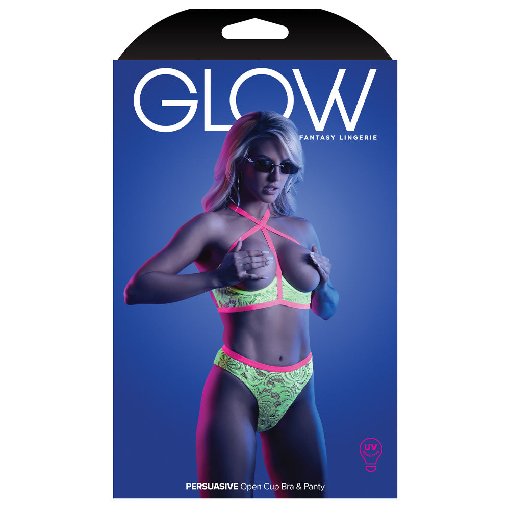 Dare to put it all on show at your next black light party, rave, or festival in the Persuasive Open Cup Lace Bra & Panty from Fantasy Lingerie's® Glow range!
