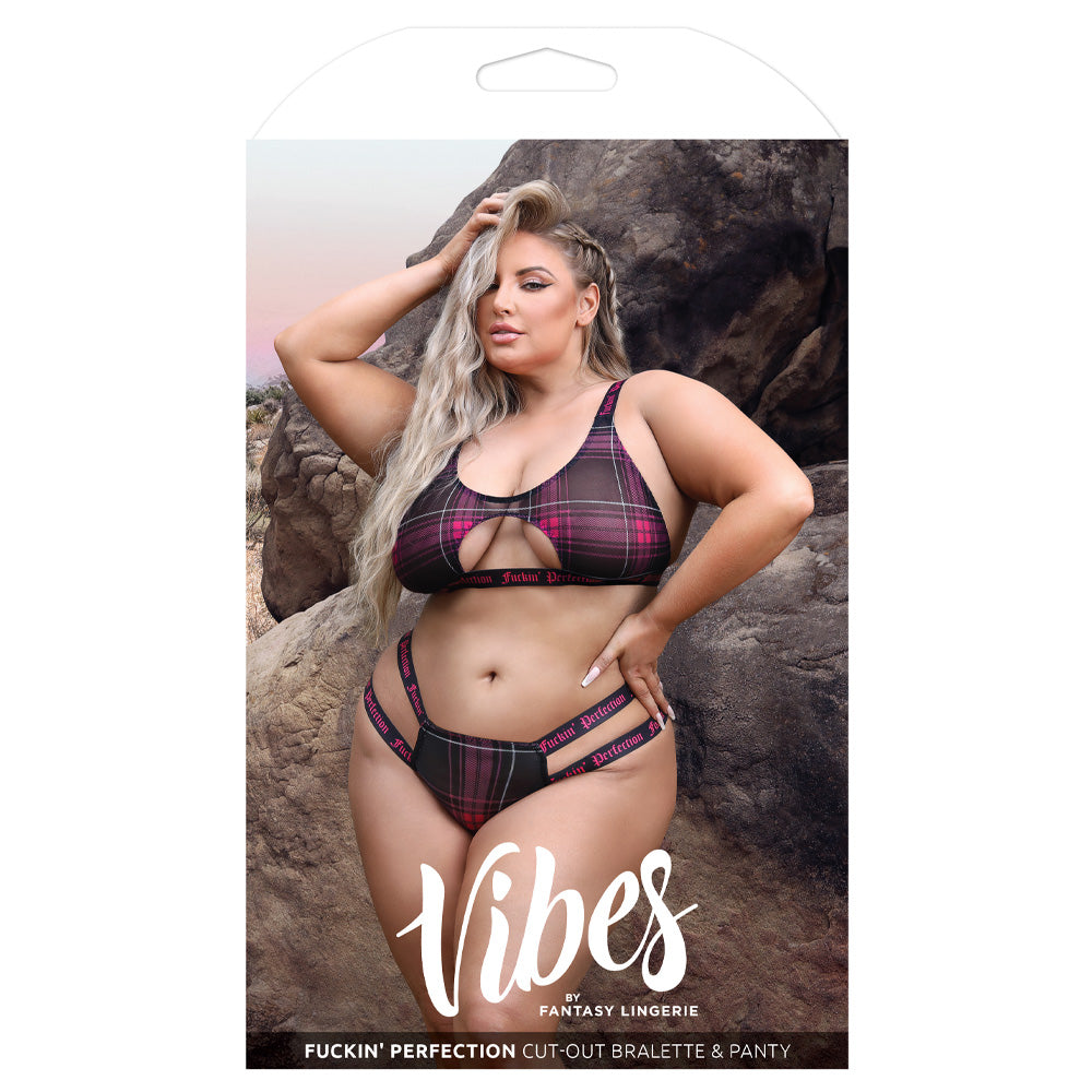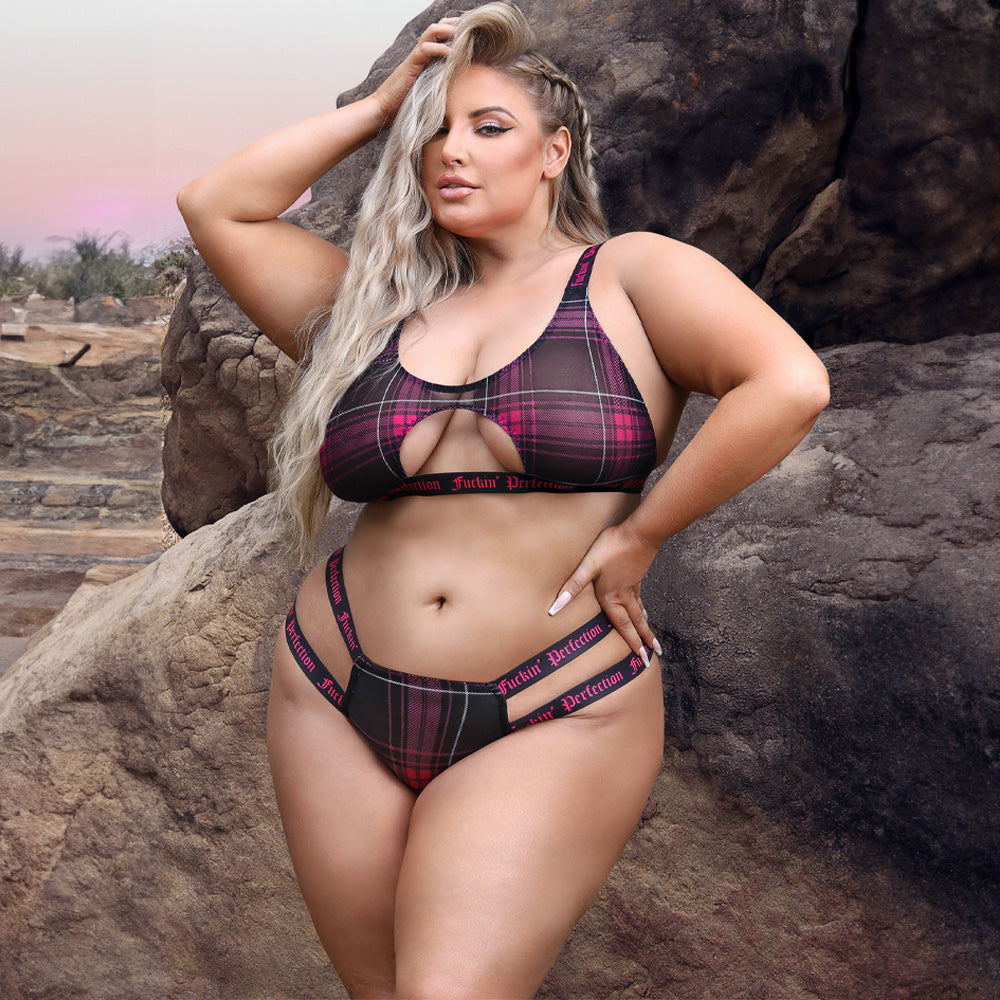 This knockout 2-piece set radiates confidence with its playful black and pink plaid pattern and edgy baddie-inspired font along the elastic underbust, shoulder straps, and caged panty sides. A motto of Fuckin' Perfection emblazoned around the elastic trim boldly declares your awesomeness while the strategic cutouts on the bralette and panty sides provide tempting glimpses of underboob, cleavage, and your hips without giving the whole show away! Meanwhile, the high-cut panty design elongates your legs, accentuates the curvature of your waist, and flaunts just the right amount of your buns in the back to keep things interesting while keeping you covered. Adjustable sliders at the straps and underbust, plus a rear swan hook closure, make this set comfortable and easy to get in and out of. You'll be ready to rock this look with unrivalled confidence at any party in need of a perfect star like you!