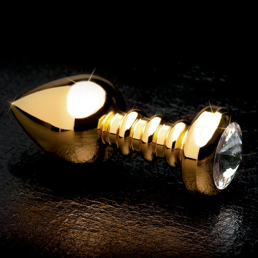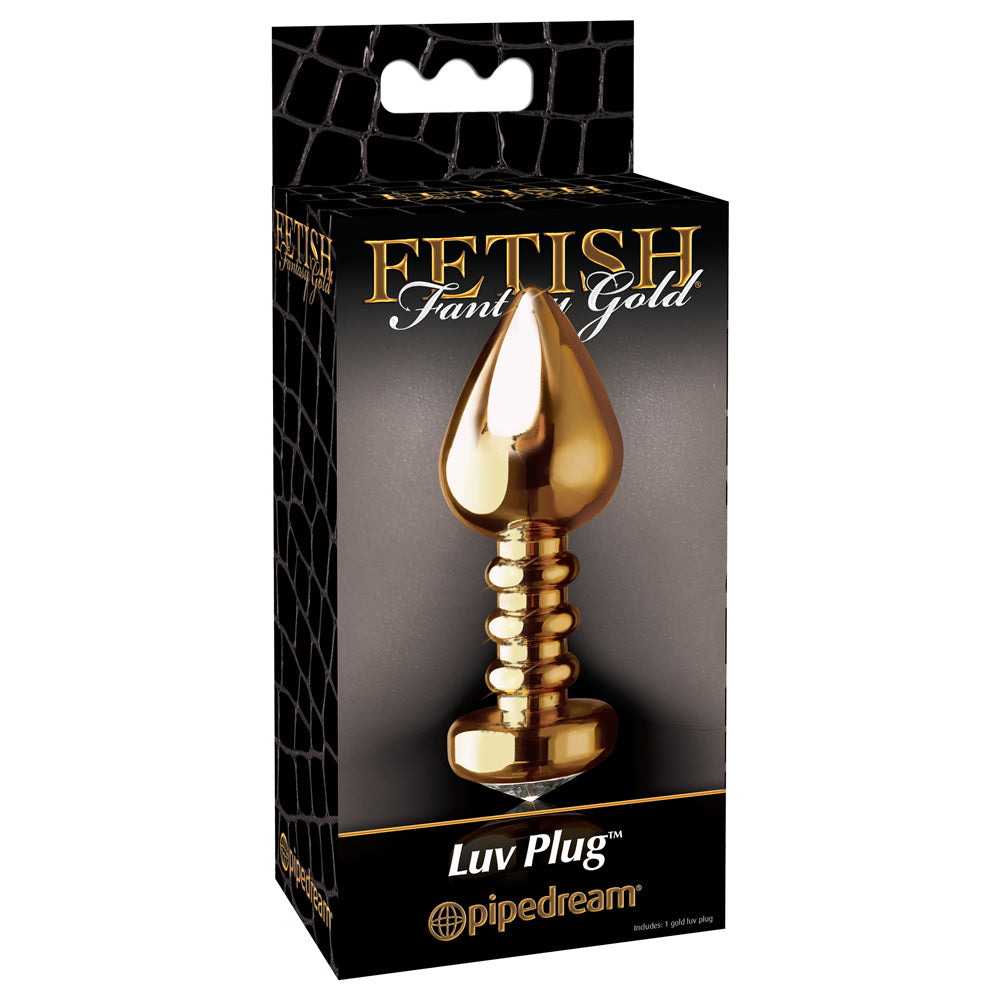 This luxurious gold metal butt plug sports a tapered tip for comfortable insertion and a flared gem-tipped base to keep the plug in a comfortable place between your cheeks. The Fetish Fantasy Gold Luv Butt Plug also sports a ridged texture along its neck for added stimulation on the way in or out, enhancing your anal adventure into a truly toe-curling experience!
