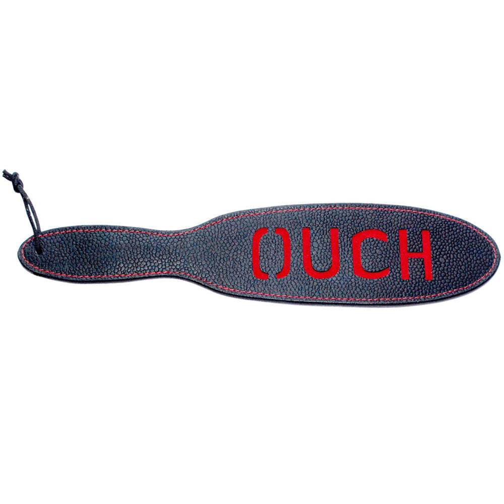 Ramp up the intensity of impact play with the Grain Leather Ouch Paddle! This spanker's black grain leather face is hand-carved to display the word OUCH in a vibrant red to warn disobedient submissives, brats, and BDSM roleplayers of the pain and punishment that's coming their way.