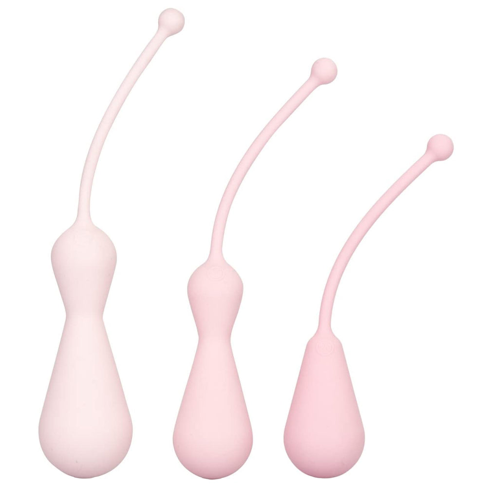 Each of the three exercisers sports an ergonomically rounded design for comfortable wear and smooth insertion, plus a retrieval cord for easy removal. The smooth silicone material is waterproof for easy cleaning and pairs well with water-based lubricant for a beautiful glide.