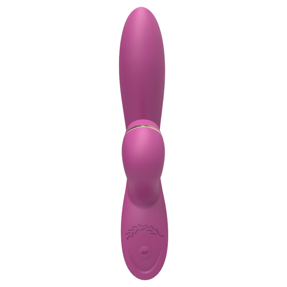 This unique rabbit vibrator has an ergonomically curved shaft topped by a bulbous head that's perfect for hitting your G-spot just right while the flexible design conforms to your curves. Hold down the ~ button and feel the G-spot head come to life as it buzzes away in 10 tantalising vibration modes, which you can cycle through with a single tap of the ~ button. At the same time, the sucking external arm works its magic on your clitoris, surrounding it with contactless pulsating air pressure waves! You can adjust between 3 modes of suction intensity by swiping over the engraved olive leaf pattern, which will also change the intensity of whatever vibration mode you're on — swipe from tip to stem to decrease the intensity level or from stem to tip to boost it to your maximum satisfaction! There's even a clever memory chip that will remember the last intensity and setting you used so you can jump right back into the fun the next time you return...