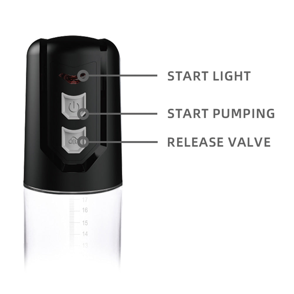 This beginner-friendly automatic penis pump features 2 suction levels that deliver perfect vacuum pressure around you, helping you achieve stronger erections and temporarily increase penis size (with regular use over time)! The simple 2-button interface keeps you in control at all times — tap the power button to turn your pump on at the first suction strength, tap again for the strongest suction mode, and tap a third time to turn your penis pump off. You can use the valve button at any time to immediately release pressure inside the chamber by tapping for incremental release or holding to let all the pressure out at once.