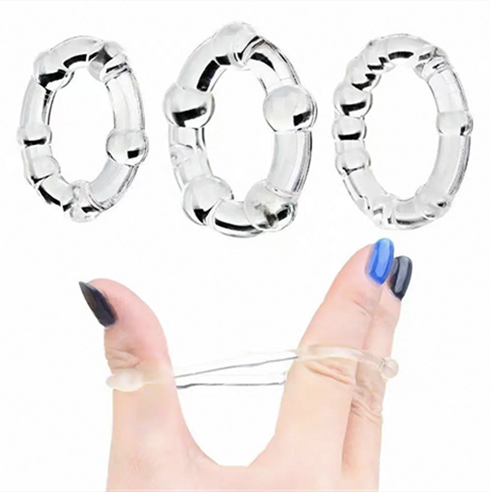 This trio of differently sized cock rings traps blood in your erect penis so it stays harder for longer, delays orgasm for longer-lasting sex, and intensifies your orgasm for an explosive finish that'll blow more than just your mind. The super-stretchy TPE fits comfortably around most wearers, and you can wear the different sized rings on different parts of your penis to customise the feeling. Each cock ring has a beaded texture for a different sensation against your skin and your partner's, which you can enjoy on its own or stack multiple rings at once for an even stronger effect!