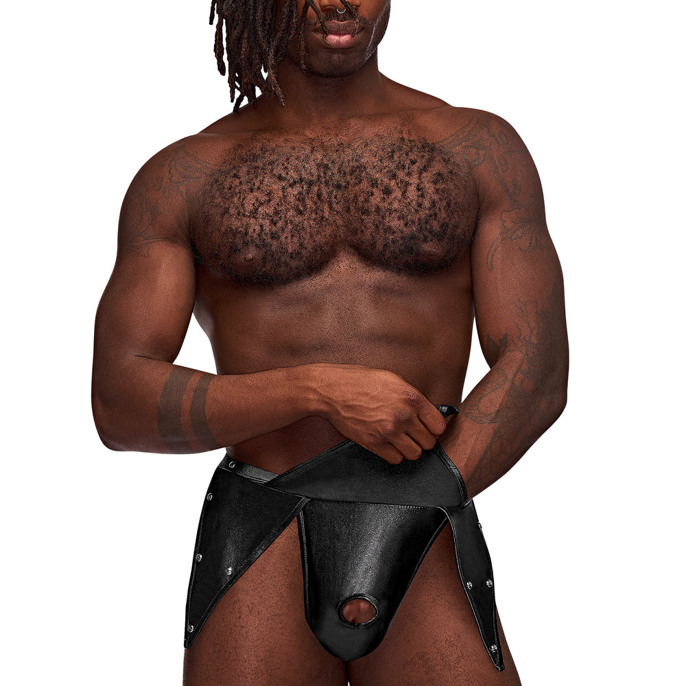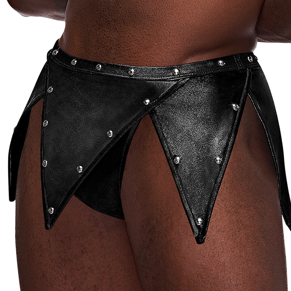This unique gladiator-inspired fetishwear features a triangle-cut design with the kilt's centre flaps in the front and rear covering your most intimate assets. You can lift the flaps to expose more skin, as well as the attached thong underneath, which features a cutout peephole for your package and a seriously tantalising view of your buns! The 4-way stretch material feels comfortable against your skin and is adorned with decorative metal studs for an eye-catching finish that's sure to be a hit at your next BDSM event or private play session.