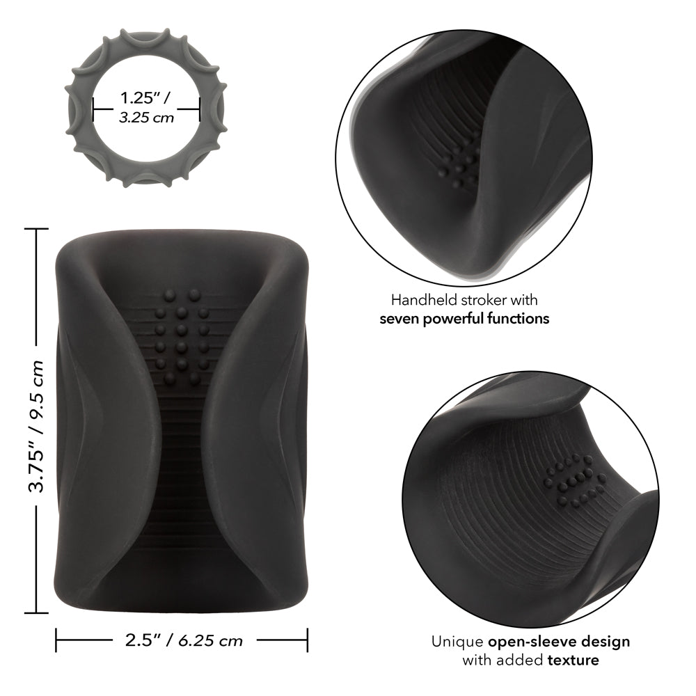 This vibrating male masturbator sports a flexible winged design that envelops your throbbing member between textured ribs, ridges, and nodes to massage you to climax in no time. The Vibrating Pro Stroker boasts powerful dual motors that deliver 7 heavenly vibration modes through the silicone body, which includes a unique head teasing texture for awesome stimulation where you want it most. There's even a memory function that remembers your favourite setting and takes you straight there so you pick up where you left off!
