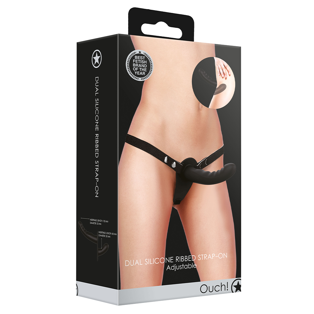 Be rewarded with your own stimulation as you give out pleasure with the Adjustable Dual Silicone Ribbed Strap-On from Ouch!
