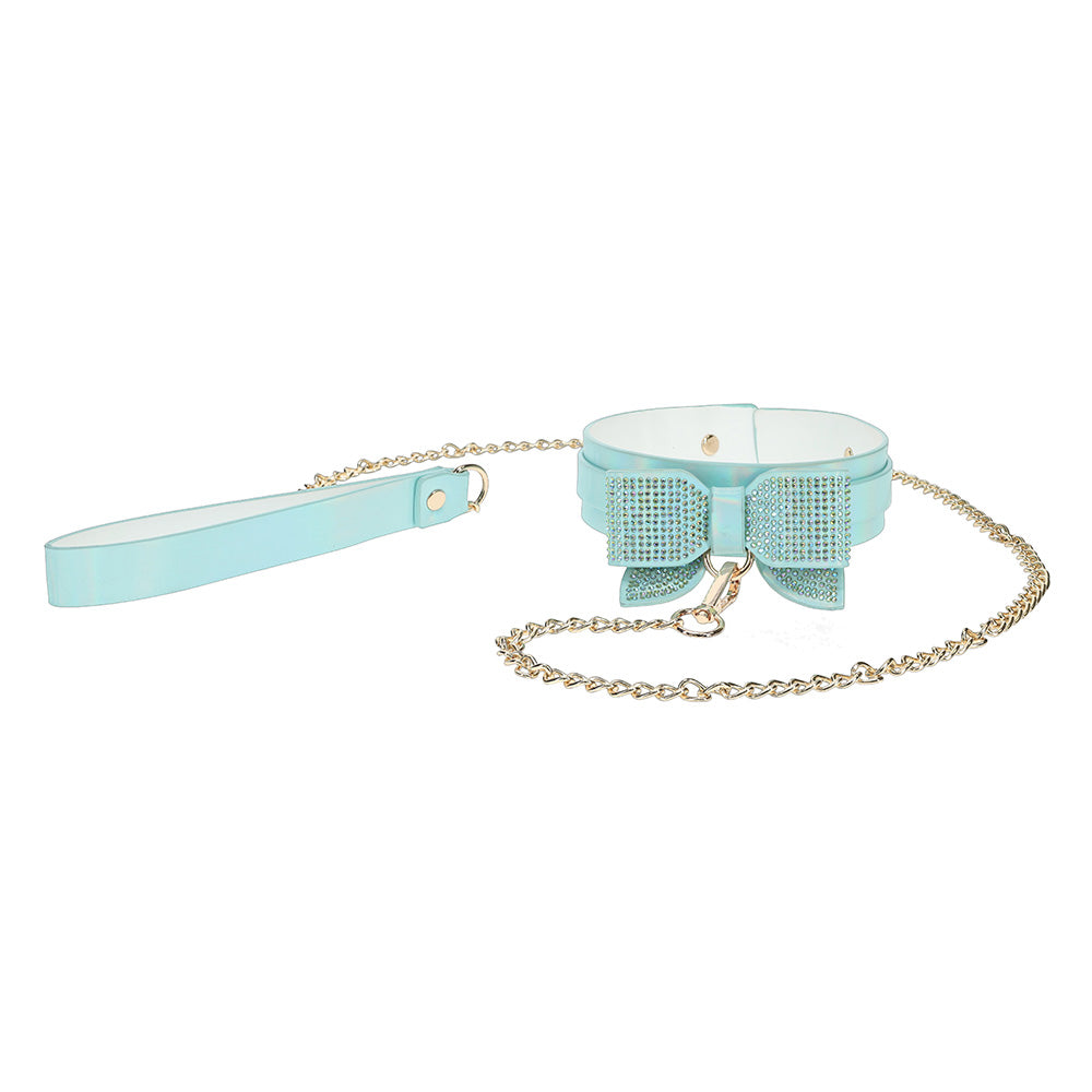 This gorgeous vegan-friendly collar and chain leash combo is sure to have all eyes on you where they belong, whether you're obediently following your partner at a BDSM party or playing in private. An eye-catching bowtie is adorned with glimmering diamante crystals, complementing the iridescent aqua material while the sturdy and sophisticated gold metal hardware ensures there's no escape. The leash is easy to attach to and detach from the collar's D-ring via an easy-to-use lobster hook and is compatible with other bondage accessories (sold separately) or wearing the collar on its own for a glamorous look!