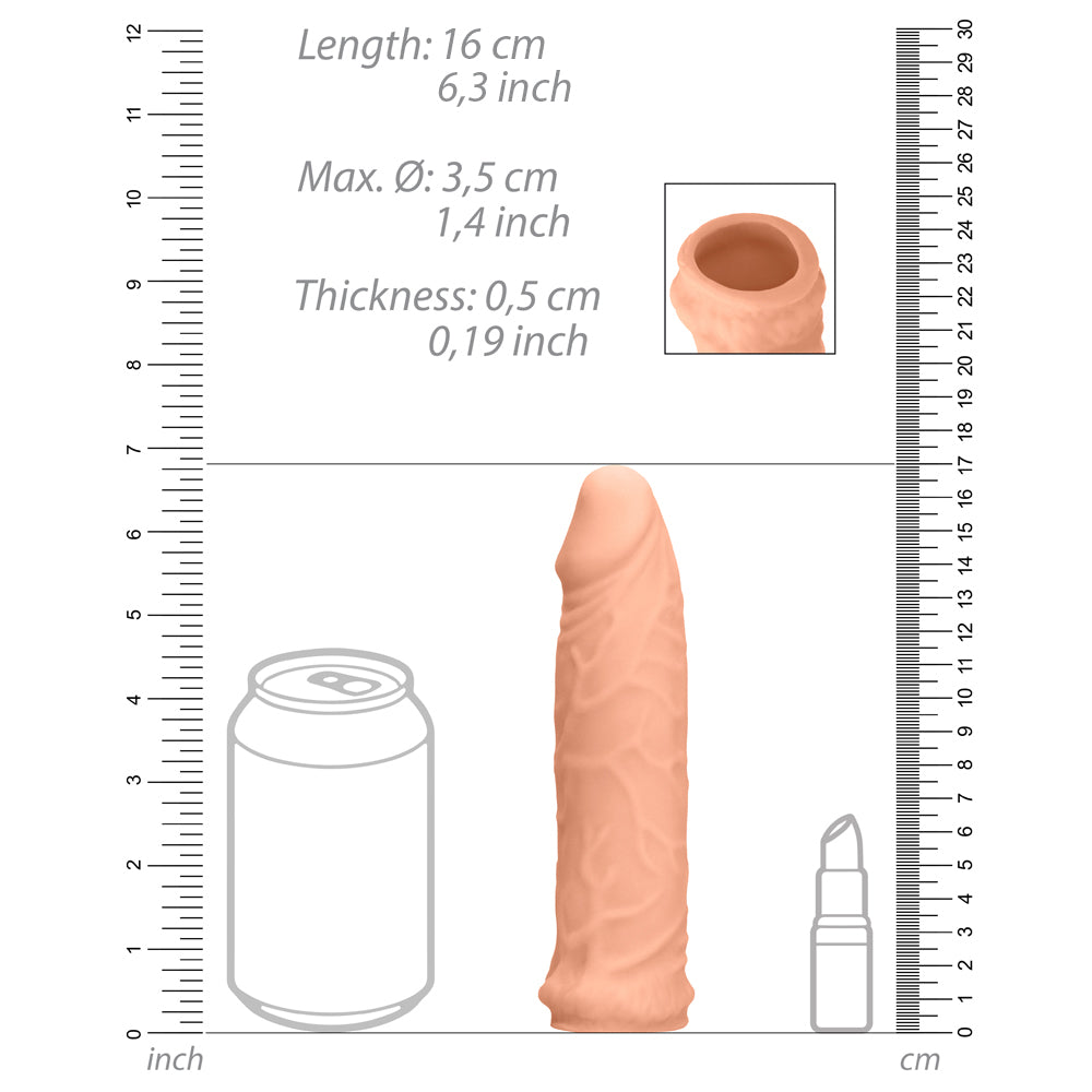 This natural-feeling penis sleeve is a hollow shaft that fits comfortably over your erection and has a squishy but firm head that adds 3 extra centimetres of usable length to your erection. The ridged head is sculpted to look and feel just like the real deal, with bulging veins all over the shaft for extra stimulation with every thrust! The sleeve is made from skin-like TPE for that ultra-realistic feeling you're both craving and is expertly sculpted to have a lifelike look. Once your fun is done, just rinse the waterproof material with warm water and toy cleaner to get your extension sleeve ready the next time the mood strikes!