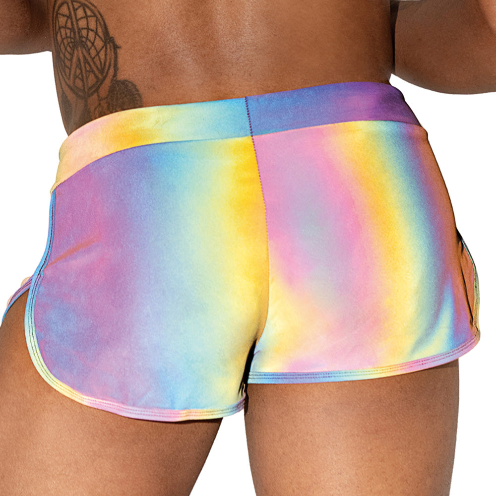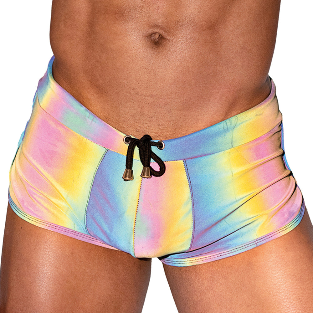These show-stealing shorts are sure to have all eyes glued to you thanks to their holographic rainbow finish against a dark material that catches the light perfectly, plus their figure-hugging fit that shows off your physique. The drawstring waistband lets you customise the fit around your hips and the seamed front pouch adds definition to your package while also giving it the room and support it needs for you to look, feel, and perform at your best. The rear coverage keeps everything under wraps, but only just as the curved hem of the shorts rides up the sides of your thighs to reveal a tantalising extra sliver of skin, making you the star of the show from all angles...