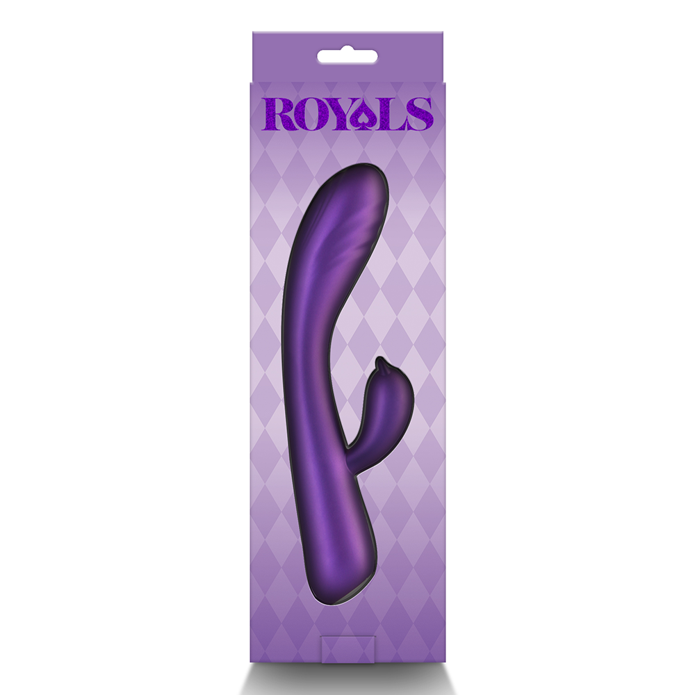 Treat yourself to simultaneous stimulation worthy of royalty with the Royals Duchess Metallic Silicone Rabbit Vibrator!