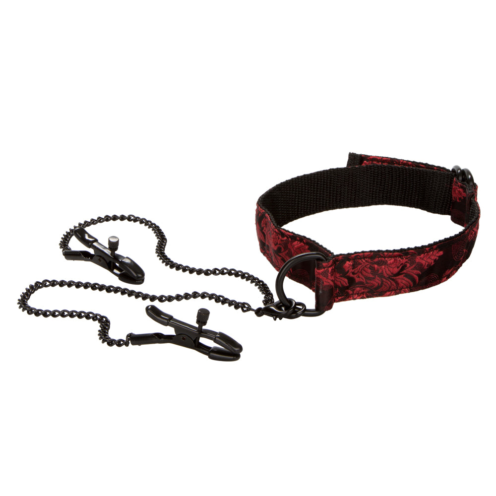 - Includes a stretchy blindfold, universal cuffs, nipple clamps + collar & leash