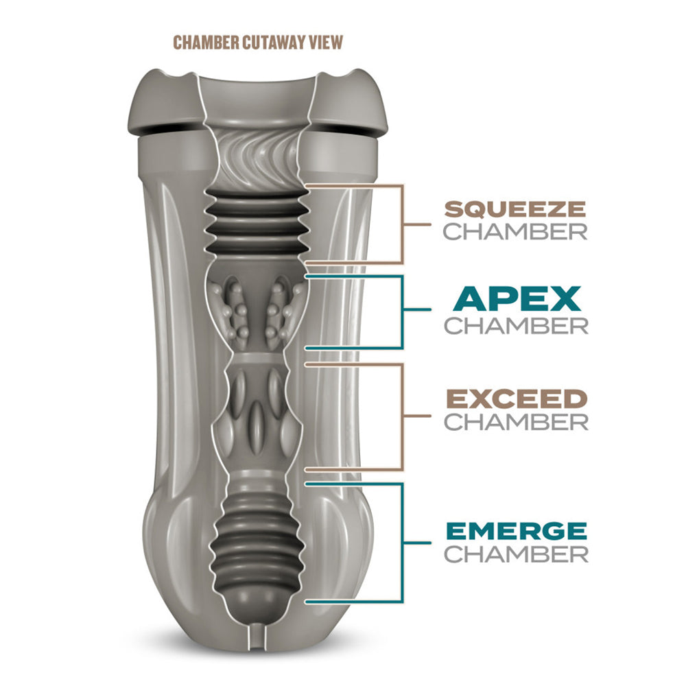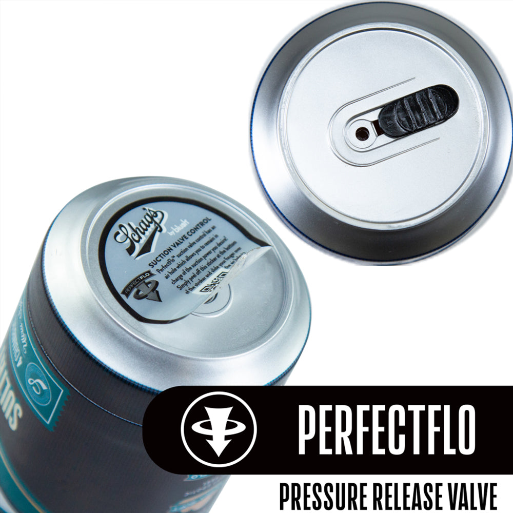 This discreet sex toy contains 4 fantastic textured chambers to stimulate every inch of you from head to base. The Squeeze Chamber wraps tightly around you with a series of parallel ridges before the Apex Chamber's rounded ticklers rub all over you. The Exceed Chamber uses disc-like nubs to slide along your shaft before the Emerge Chamber tantalises the head of your penis with soft, round ribs that'll have your knees quaking in no time! At the end of the can, the Perfect-Flo™ suction valve lets you adjust the suction intensity to your liking simply by covering or uncovering the air hole with the built-in slider.