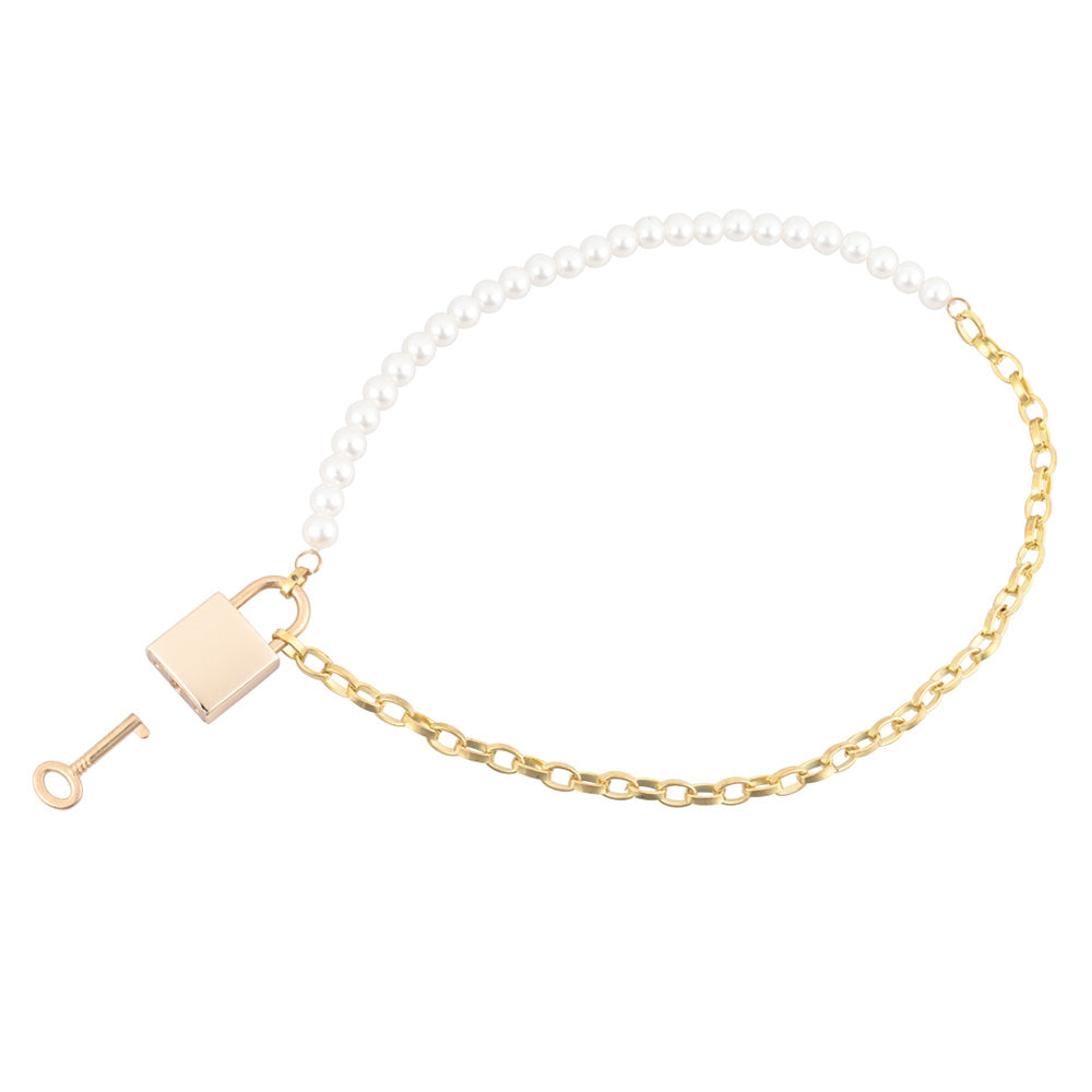This sophisticated necklace shows off your collared status in style with a half-strand of shiny faux pearls that transitions to a gold chain that drapes around the other half of your neck for a uniquely modern yet elegant look. A matching gold lock and key holds the necklace together and you can adjust wear the lock secures for a tight or loose fit, or even style this day collar as a cute charm bracelet by wrapping it around your wrist for even more discreet wear!