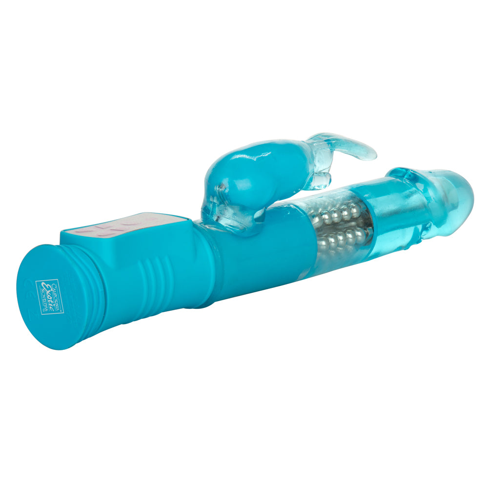 This energetic rabbit vibrator features a ridged, phallic head atop a rotating shaft that is sure to feel fantastic inside you while the flickering bunny ears dance over your sensitive clitoris for blended orgasmic bliss. It vibrates in 8 amazing functions for awesome external stimulation while the 5 rows of non-jamming beads rotate in 4 speeds inside you to massage your inner walls just right. This rabbit vibrator is fully waterproof (as long as the battery cap is screwed on tight), perfect for getting wet and wild in the shower or bath, followed by easy cleanup!