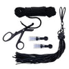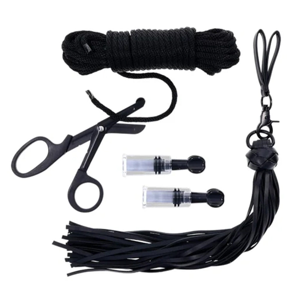 The bondage safety scissors have a flattened, curved edge to easily get under the rope and snip away without damaging the submissive's skin, though the rope has anti-fray capped ends, which also make it a cinch to find the ends of the rope to quickly untie or adjust. The flogger has dual loops that fit anybody's fingers for easy and accurate swinging, perfect for tickling, teasing, or delivering a torturous sting to keep even the cheekiest brats in line. To really put your sub on the edge, the nipple suckers use a twist-suction system and have an airtight seal to draw out their nipples for maximum sensitivity!