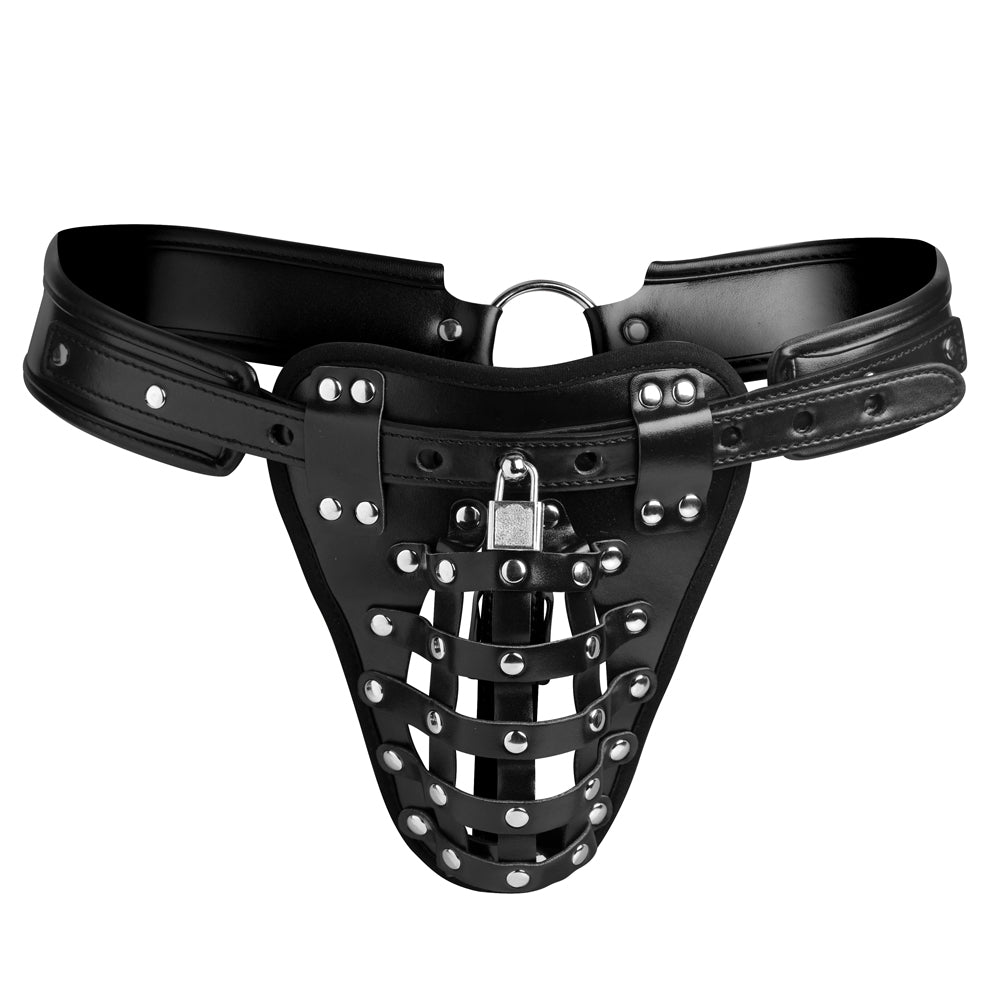 This faux leather jockstrap encapsulates your man's package and takes away his access to his shaft and balls. One strap wraps around his waist while another sits between his cheeks, and they're both adjustable for a comfortable yet totally inescapable fit. You can also use the included padlock on the Strict Netted Male Chastity Jock at the front and back to ensure he keeps his hands to himself until you decide he deserves it!