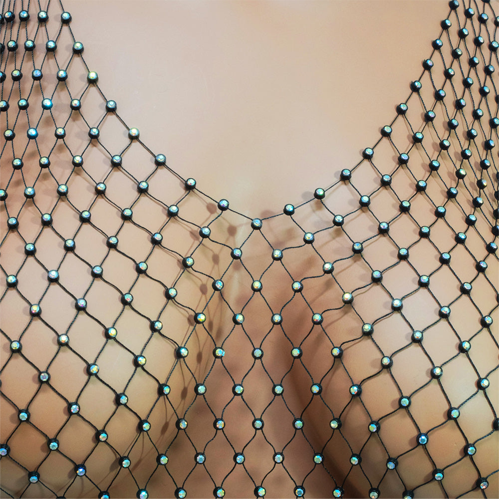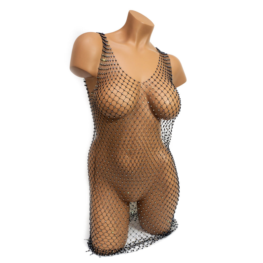 This lightweight overlay dress is sure to draw all eyes to you as you flaunt your figure beneath this striking one-piece. This stretchy, sleeveless dress features an open-weave design that offers tantalising glimpses of your skin through the net design and reaches a stylish mid-calf length for a modern silhouette. The dress is studded with hundreds of sparkling diamante crystals to create a perfect showstopper piece for everywhere from the bedroom to fetish events to summer festivals. Layer the dress over a contrasting outfit, lingerie, or nipple pasties (sold separately) for a glamorously trendy look!