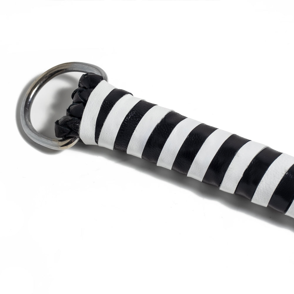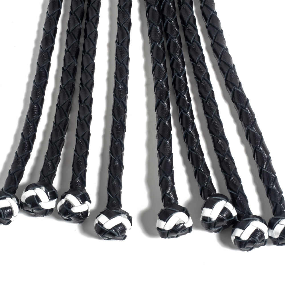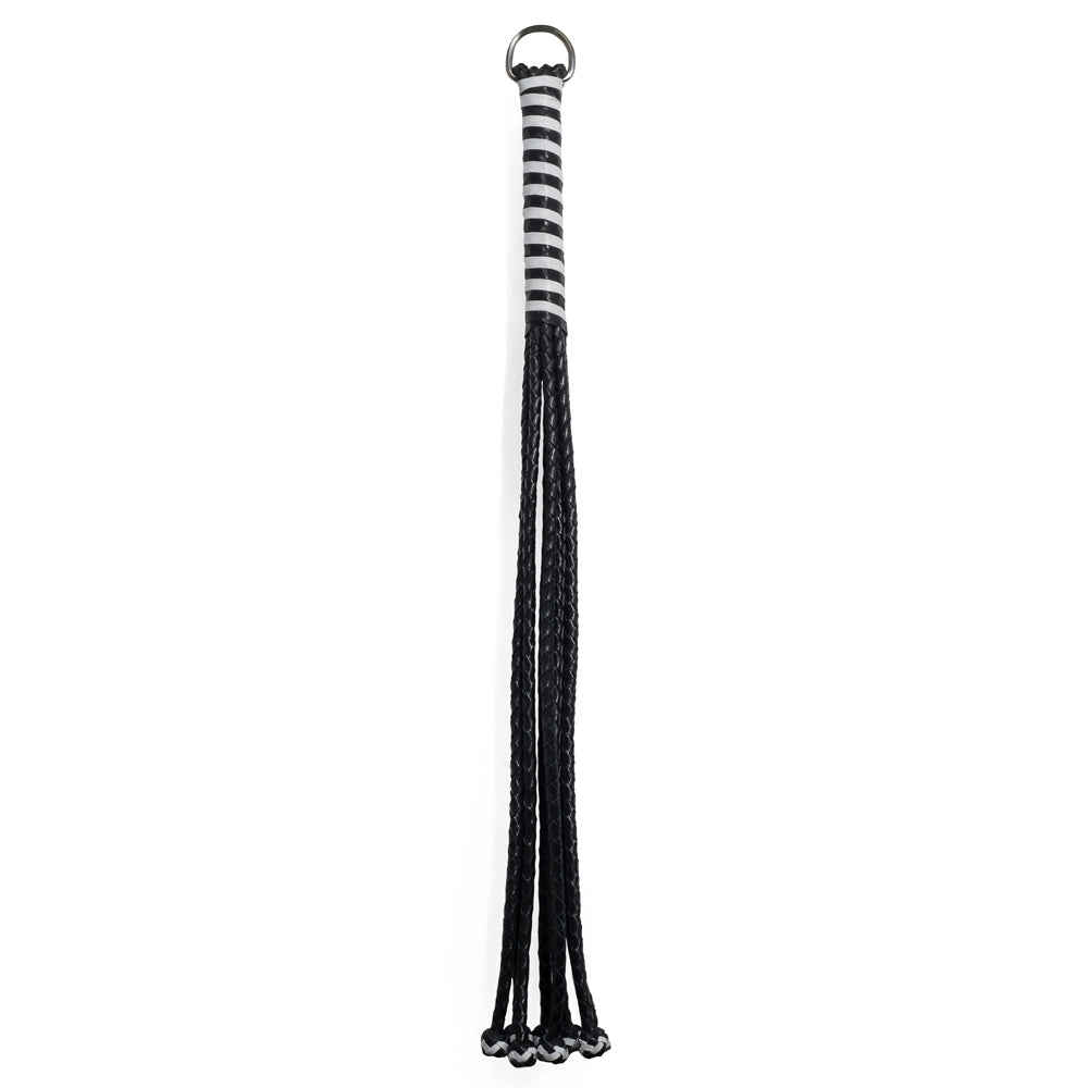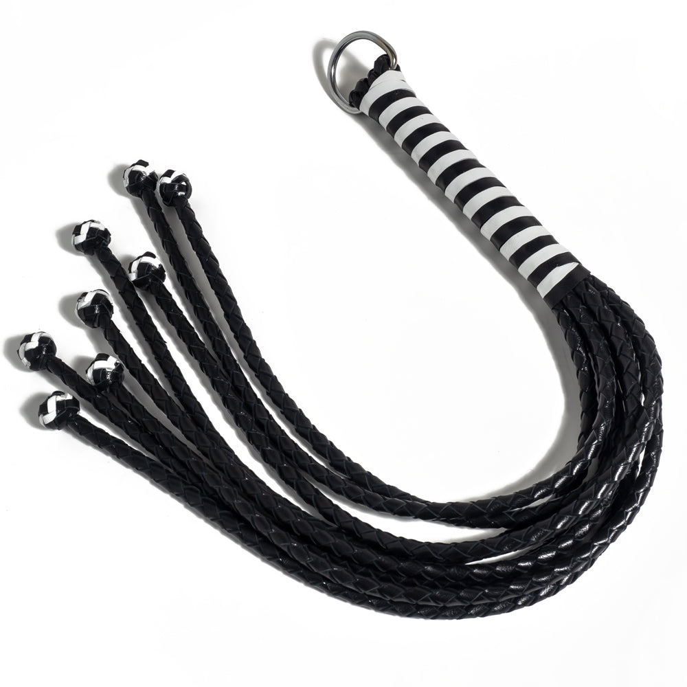 This intense impact play accessory is best suited to experienced fetishists thanks to the 8 firm leather balls tied in a monkey fist knot at the end of the braided falls. These provide the sensation of being hit with small fists, which is sure to erase any thoughts of disobedience from your playmate's mind as the pleasure and pain rain down upon them! The premium leather falls are wrapped tightly in a black and white candy stripe handle to give you a firm grip on the Braided Monkey's Fist Flogger as you wield it. A metal loop through the end makes it easy to hang up this flogger, perfect for storage or display with the rest of your BDSM tools.