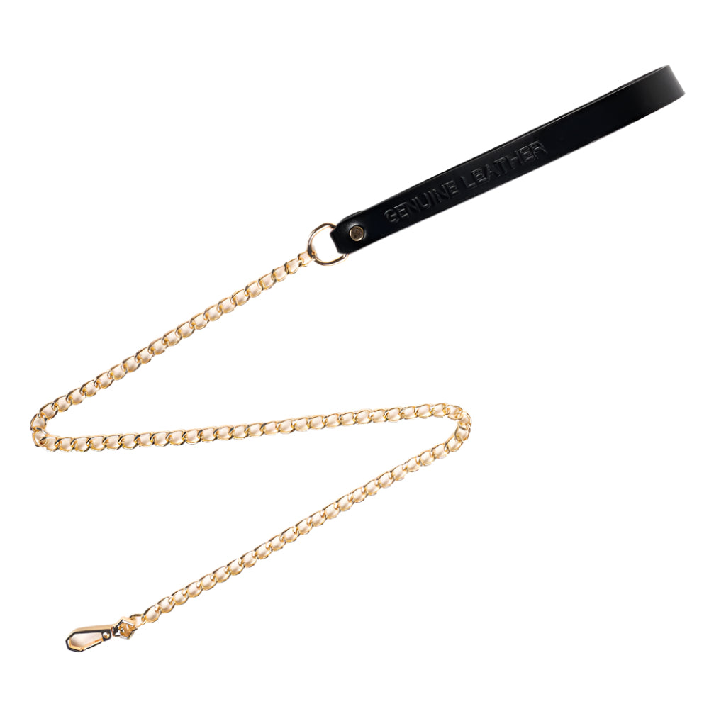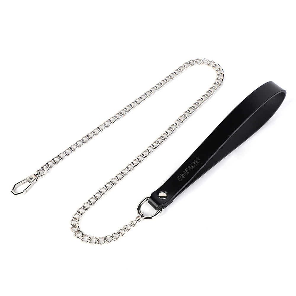 This classic BDSM leash looks sleek and formidable all at once with its no-nonsense genuine leather wrist loop handle, accented with burnished edges for a stylish, polished finish. The gleaming metal hardware is bolted through the leather for a sturdy and durable finish and features a non-swivelling D-ring for more control over naughty subs and brats who think they can pull away! The snap hook makes this metal chain leash easy to attach to any collar, or you can get creative with other BDSM accessories like body harnesses and cuffs (all sold separately) and experiment with more intense bondage scenes...