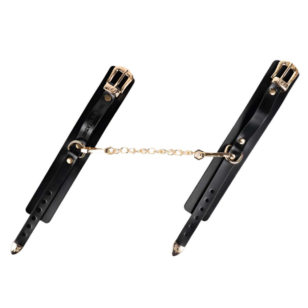 These stylish ankle cuffs are sure to maintain a secure hold on your playmate with their wide design and sturdy metal hardware that's bolted through the cuffs, including engraved buckles and tail tips that add a beautiful Western-chic element to the look. The genuine leather material has burnished edges for an elevated, polished look that feels lovely and smooth against the skin too. A pair of non-swivel D-rings restricts the wearer's movement even more, and the adjustable buckles let you get a perfect fit every time while the metal keepers let you tuck in the tails for a neat finish that lets this sleek set shine against the wearer's skin. Just attach the included dual-snap hook chain to the D-rings and you're ready to play!