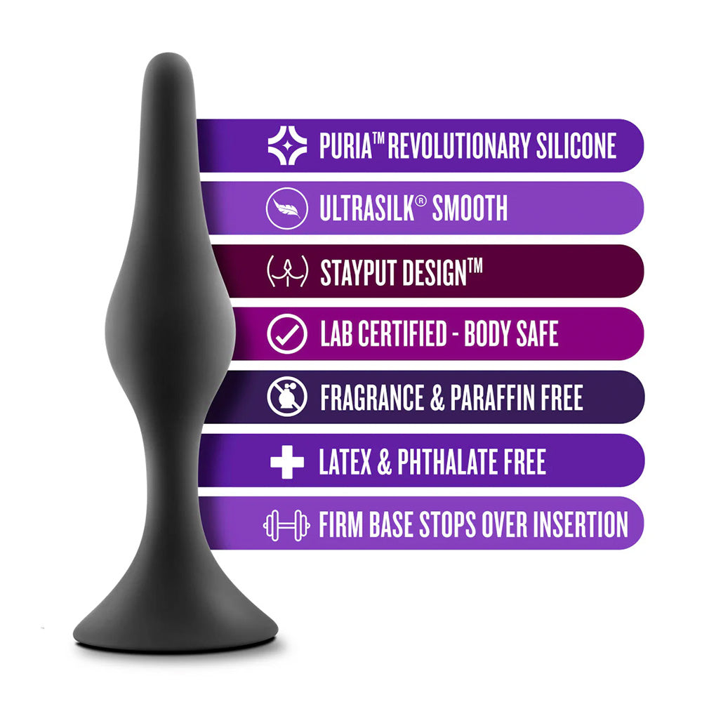 All the plugs are blessed with a suction cup base, which can be mounted to any flat, solid surface for hands-free fun, and also double as stoppers that keep the plugs at a safe depth and make removing them easy. The UltraSilk® platinum-cured Puria™ silicone offers a silky-smooth, body-safe finish that's waterproof for easy cleaning once your fun is done, or anal training in the shower or bath!