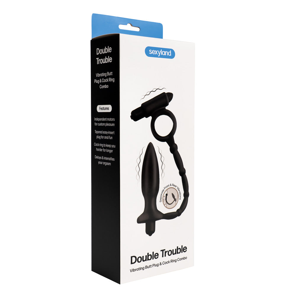 Enjoy your most intense climaxes of all time with the Double Trouble Vibrating Butt Plug & Cock Ring Combo from Sexyland!