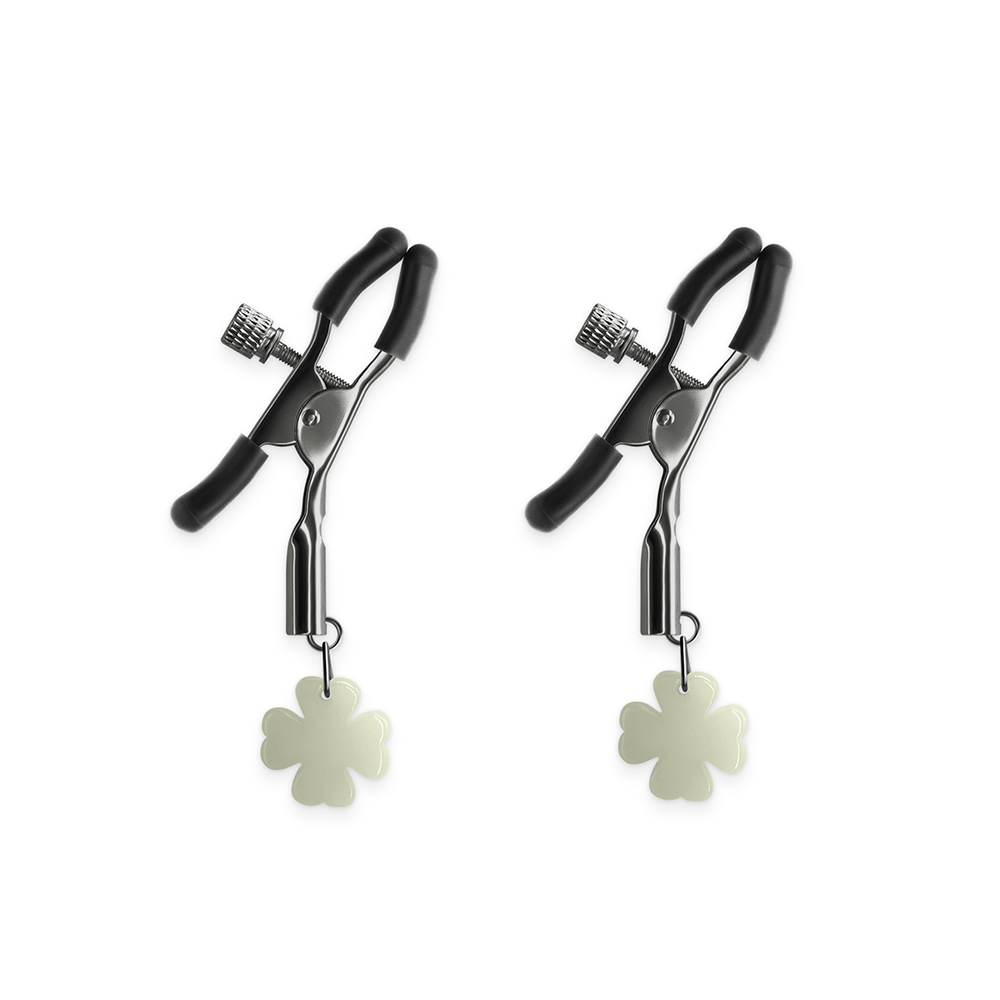 These nickel-free nipple clamps add a fun and fetish-tastic touch to your kinky play, delivering that iconic pinching sensation you know and love to tantalise your nipples. The removable silicone tip coverings keep you comfortable while the adjustable tension screws let you customise the pinching intensity for your perfect amount of pleasure and pain! Decorative glow-in-the-dark shamrock charms dangle from the clamps and ensure your lover keeps their eyes right where they belong, whether you're trying your luck in a well-lit bedroom or a dungeon plunged into darkness...