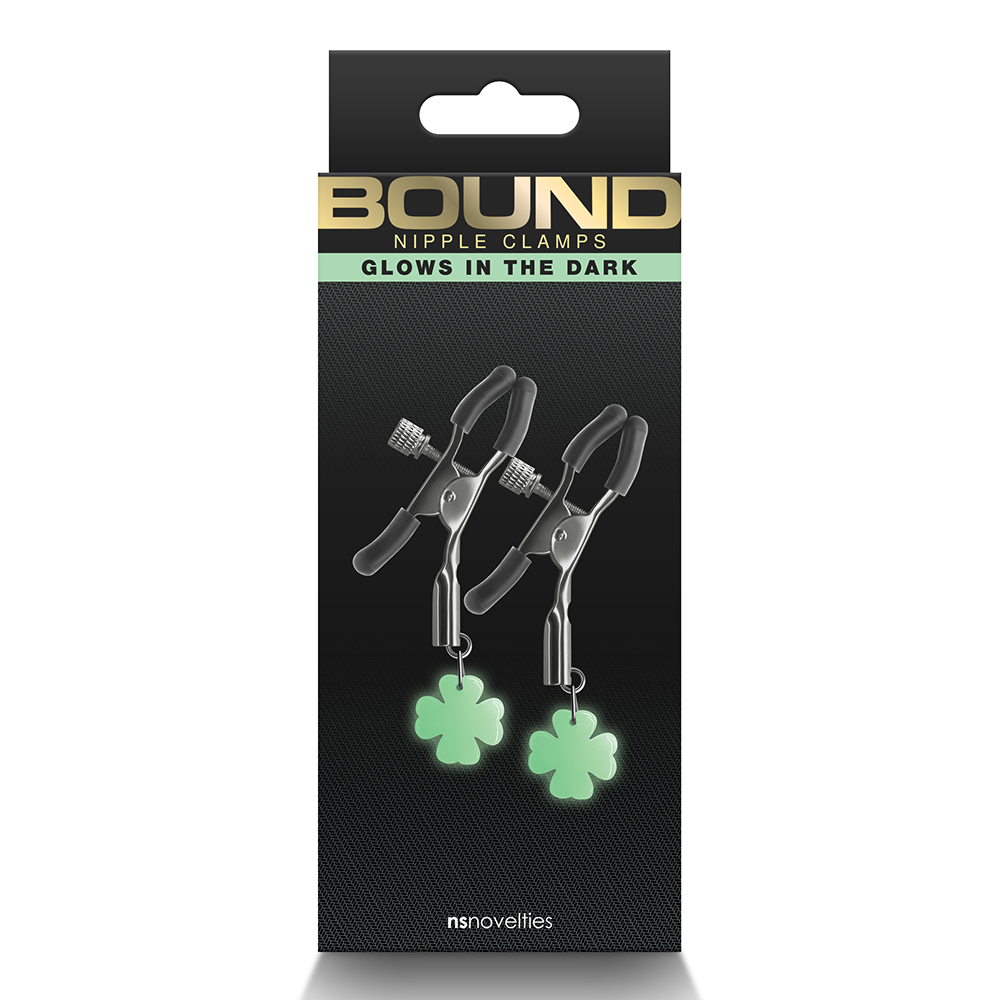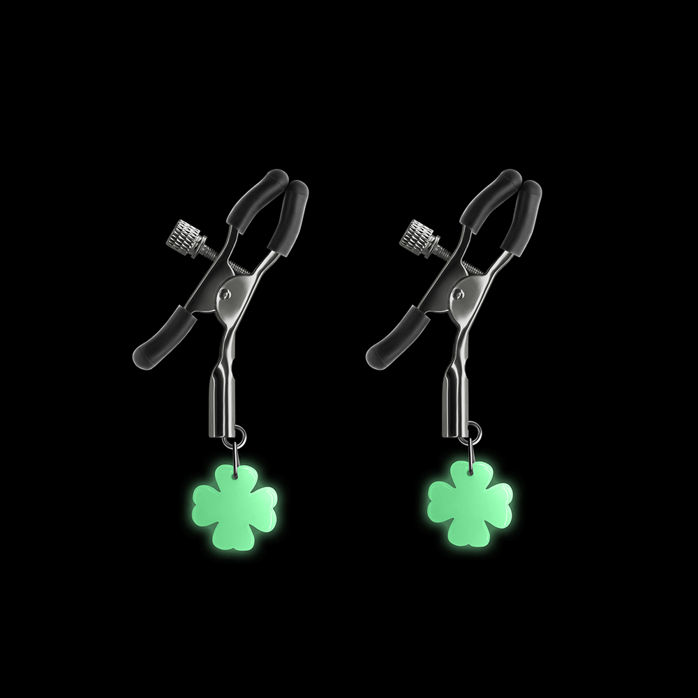Get lucky with the lights on or off in the G4 Nipple Clamps With Glow In The Dark Shamrock Charms by Bound!