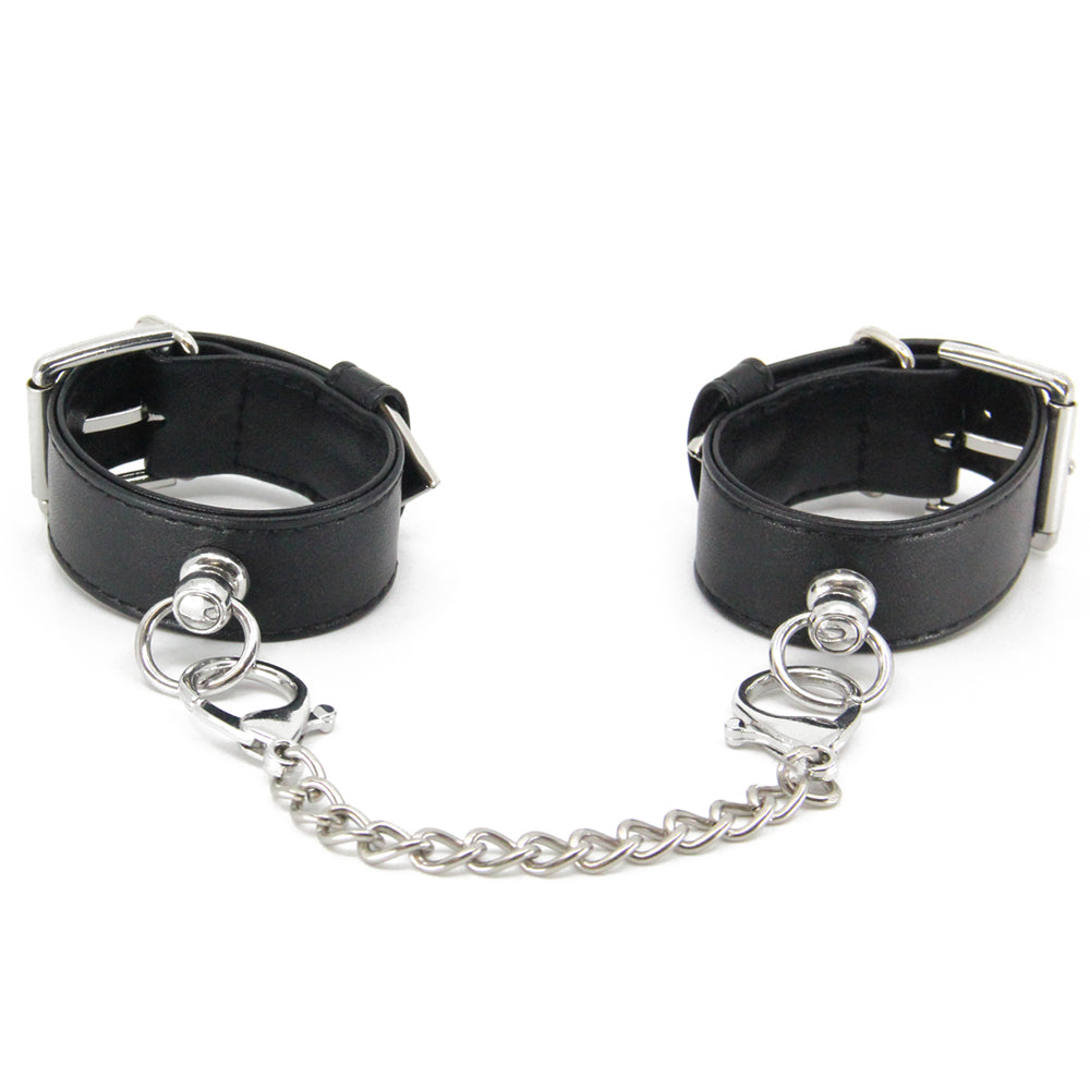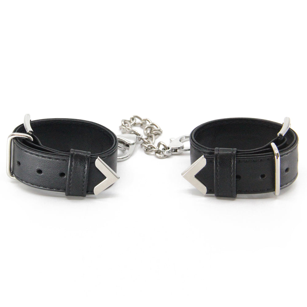 This lightly padded pair of flat leather cuffs has silver Western-style tips on its V-shaped tails, just like your favourite Western belt and the matching collar. The rotating O-rings let the wearer have some freedom of movement while the double clip chain connects the cuffs, or you can separate the cuffs to use them with other bondage accessories (sold separately). The adjustable buckle closures are adorned with double keepers to keep the cuff tails neatly tucked in for a flush finish against the wearer's wrists, perfect for playing behind closed doors or at fetish events.