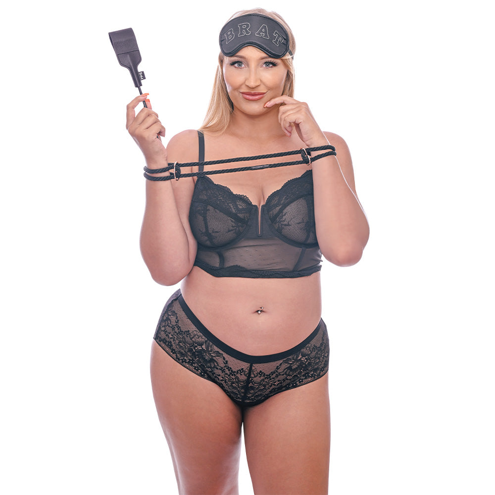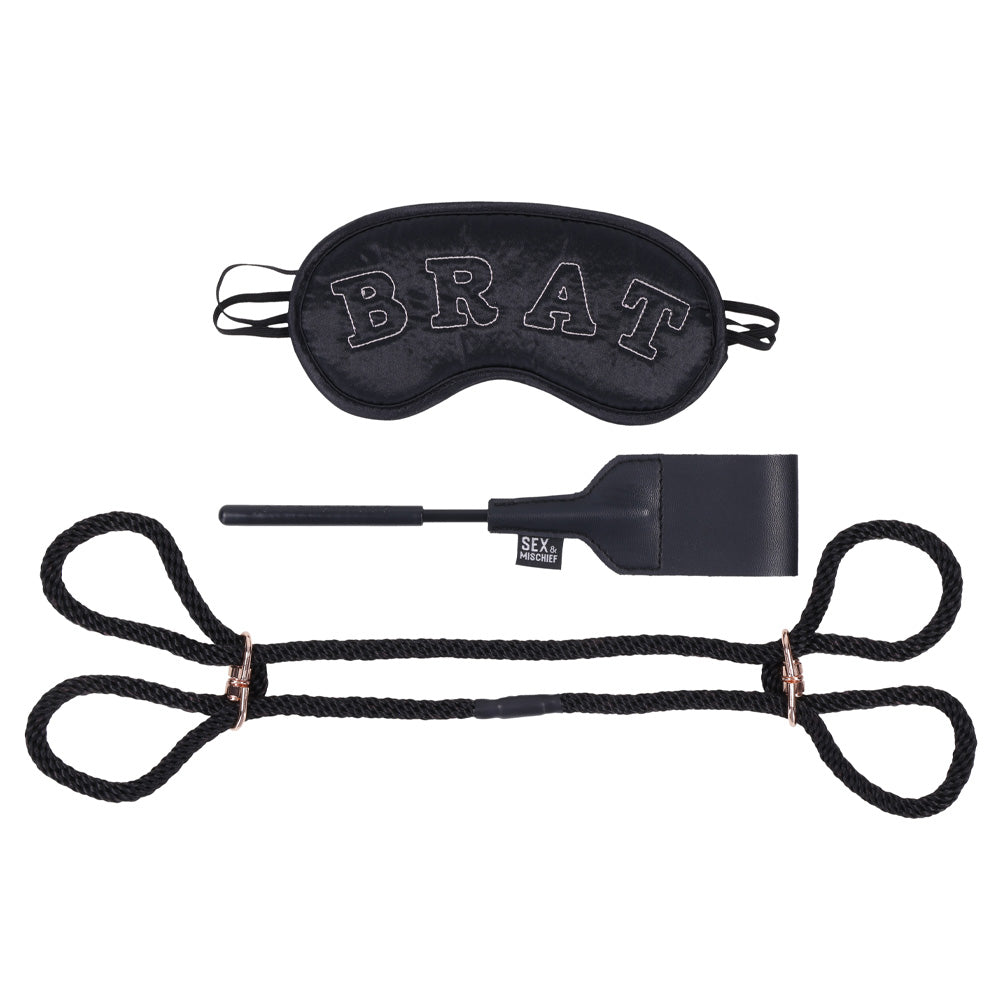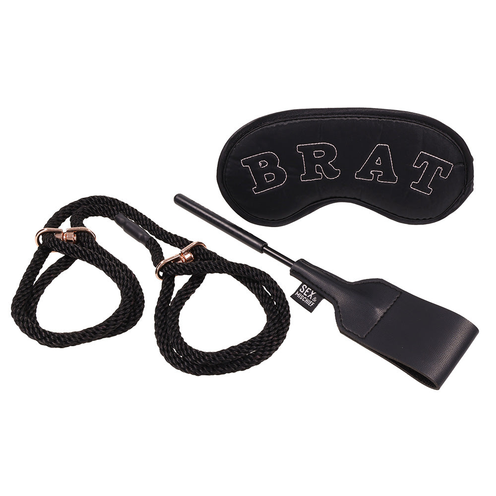 - Includes looped rope restraints, a mini riding crop & a blindfold eye mask with BRAT embroidery