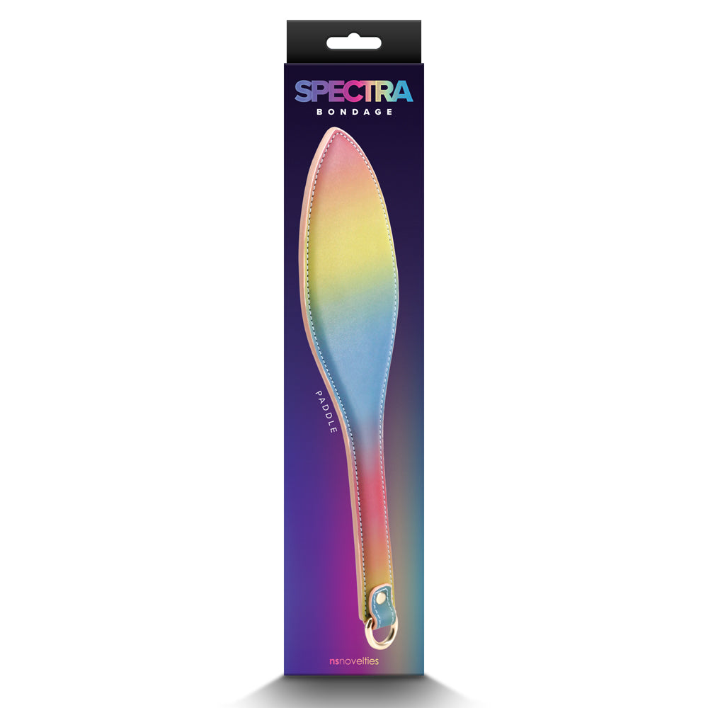 Add a rainbow twist to your impact play fun with the Spectra Bondage Rainbow Faux Leather Spanking Paddle!