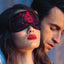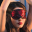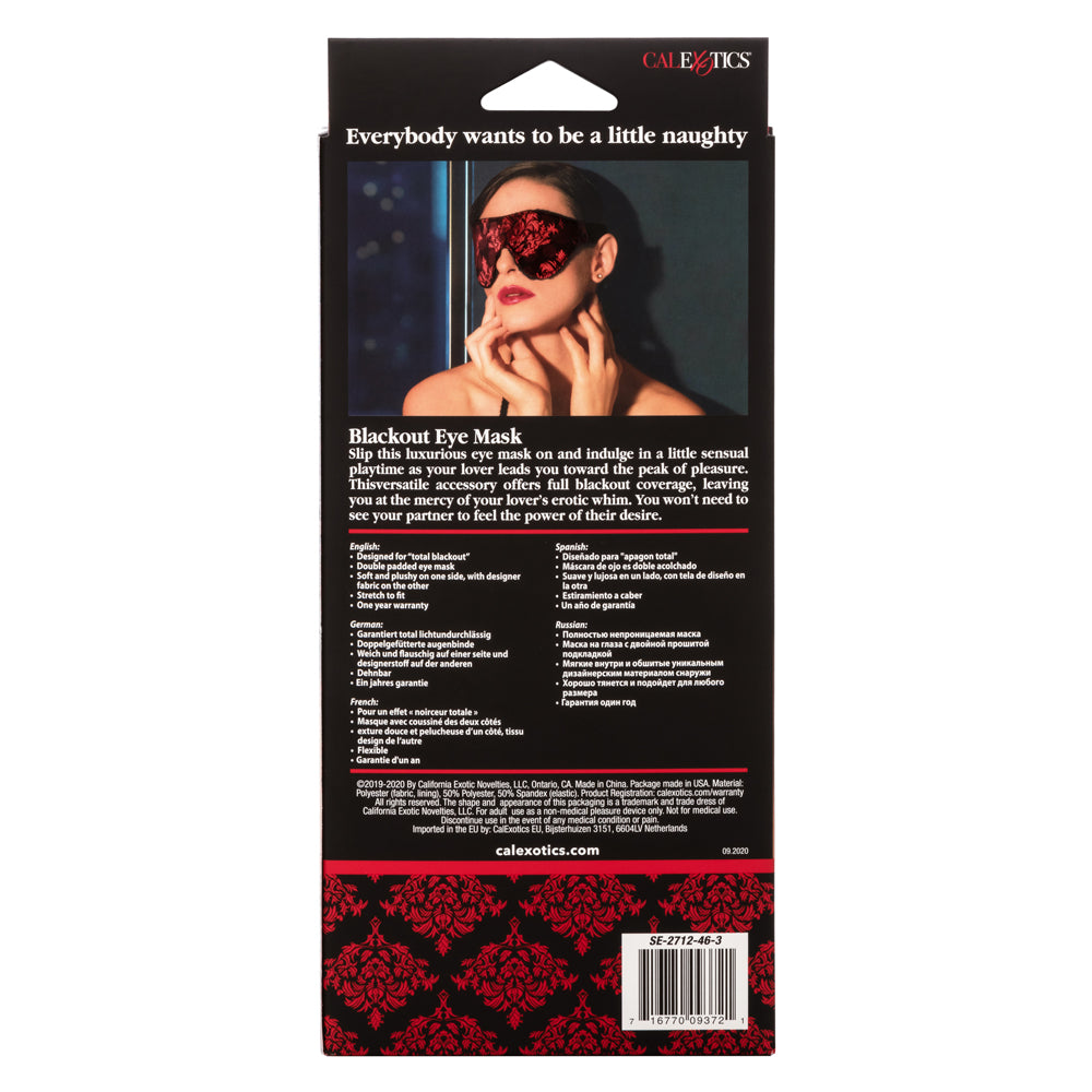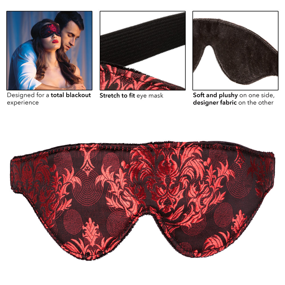 The Scandal Blackout Eye Mask has an elastic strap that fits comfortably on most wearers and is adorned with Scandal's signature red and black brocade fabric for a luxe look that complements any lingerie look or BDSM setting!