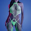 This glow-in-the-dark crotchless bodystocking combines micro and large weaves of fishnet to create a stunning ensemble that'll wow every time, whether you're at a rave, a black light party, or a music festival. It comes with a saucy little thong and a halter neck top with a large fishnet weave down the middle of your bust to reveal your cleavage. A pair of included footless thigh-highs frame the panty perfectly (or you can go commando for easy access to your intimate assets in private play events) and feature the same alternating fishnet pattern as the top for a cohesive look from head to toe! The high-neck top connects to the footless tights via a metal O-ring at the centre of your navel — if you're feeling extra-cheeky, try attaching BDSM accessories like a leash, rope, or cuffs (all sold separately) to spice up your look even more...