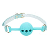 This gag has vegan-friendly faux leather straps that have adjustable gold push studs to suit and fit all kinksters, complete with an iridescent aqua finish for a high-fashion look that's sure to please more than just the eye! The aqua ball is made from silicone for a soft, comfortable feeling against the wearer's teeth and has 3 holes punched through it for easier breathing during play. After the fun is done, the waterproof silicone is a cinch to clean so it's fresh and ready to muffle the sub's moans during your next round of kinky fun!