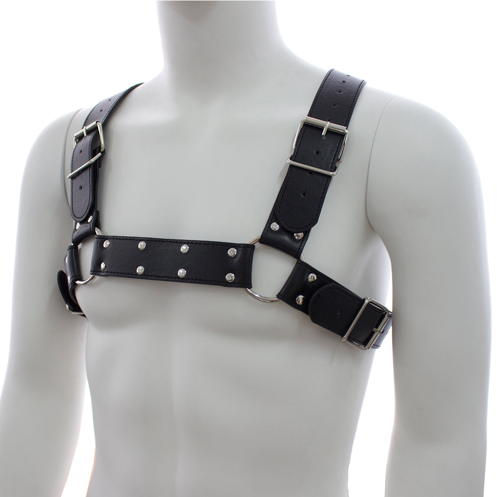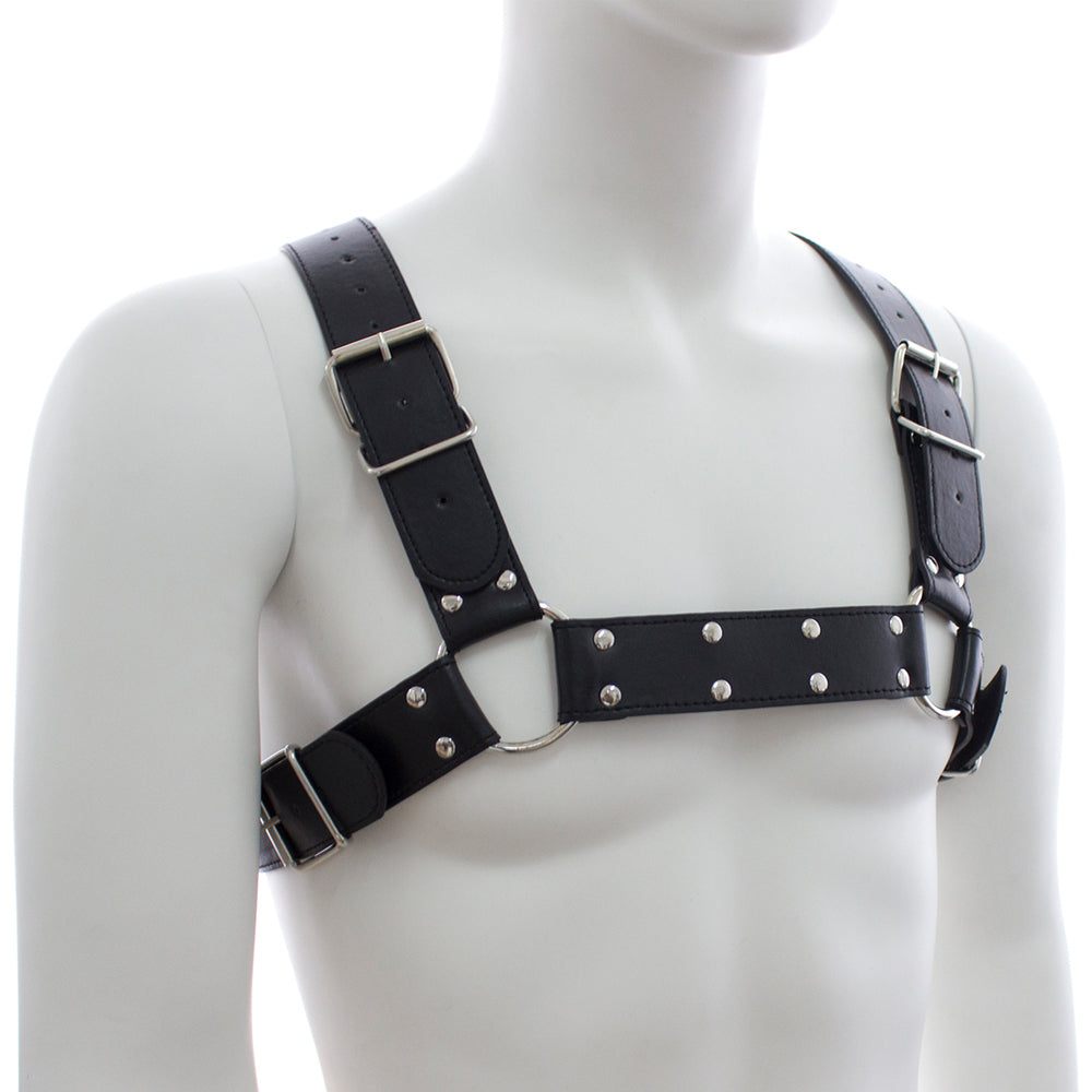 This fetishwear classic features two sturdy O-rings at the front that are perfect for attaching BDSM accessories like leashes or restraints and is embellished with metal studs for more visual interest. The shoulder and torso straps cross over in the back, preventing the straps from slipping off your arms no matter what sort of fun you get up to while wearing this Bulldog Chest Harness! You can adjust the buckle closures on each shoulder and under each arm to get your perfect fit, as well as quickly put this H-Brace on or take it off.