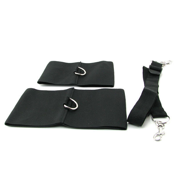 This unique restraint kit is incredibly user-friendly and holds wrists and ankles securely together in any combination. The unique design features 2 sets of stretchy but strong elastic cuffs that slide easily over the wearer's arms and legs, keeping them captive while keeping them comfortable. There is also a long tether included, which you can attach to sturdy metal D-rings at each cuff's midpoint via the quick snap-clip to lead them around, or you can use it to tie up your lover even further!