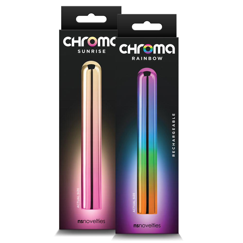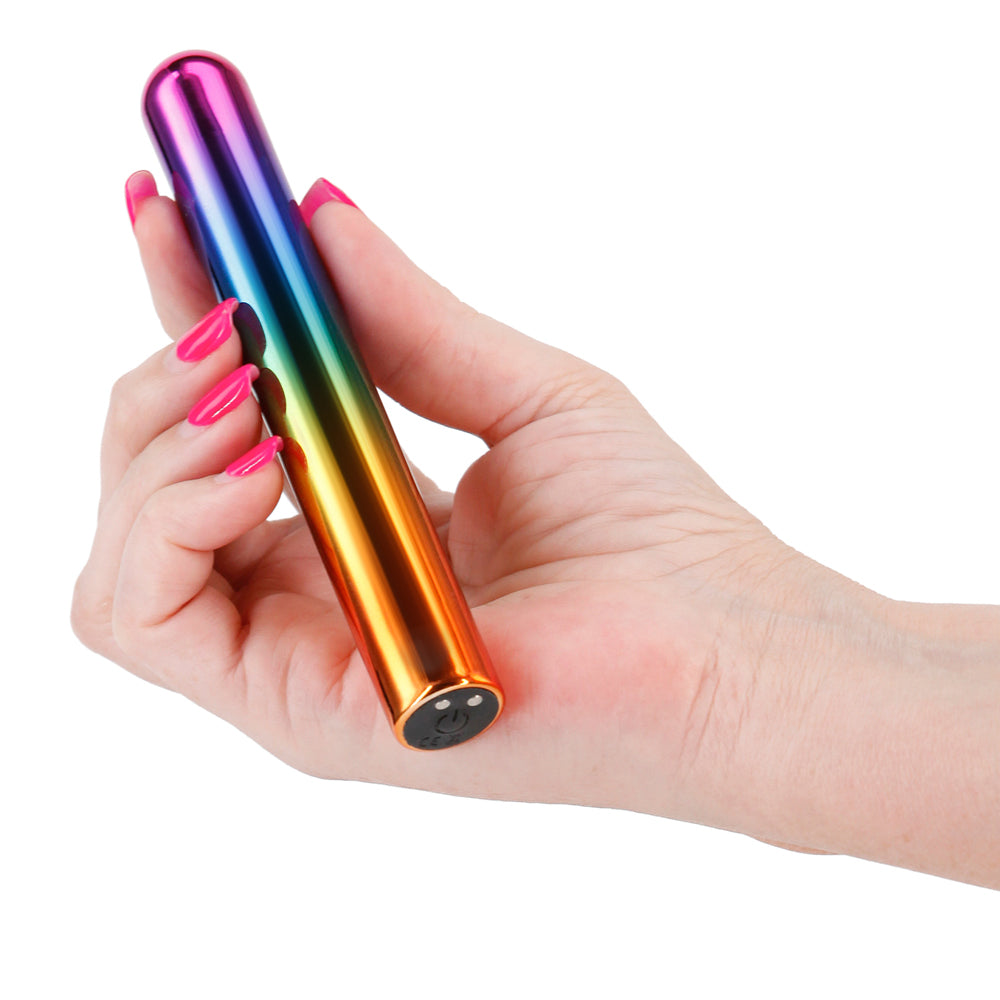 Treat yourself to some seriously good vibes with the Large Chroma Rechargeable Metallic Straight Vibrator!
