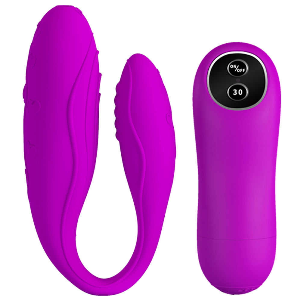 This flexible C-shaped vibrator has two rounded heads that comfortably cup your body, with the shorter head inside the vagina to press against the G-spot and the larger head resting externally on the clitoris. The inner sides of both heads are textured with slight ridges for extra stimulation and grip so they don't move from your sweet spots once the toy is in place. Use the wireless remote control to activate the Pretty Love Indulgence's dual motors, which vibrate together in 30 thrilling vibration modes for awesome internal and external pleasure!
