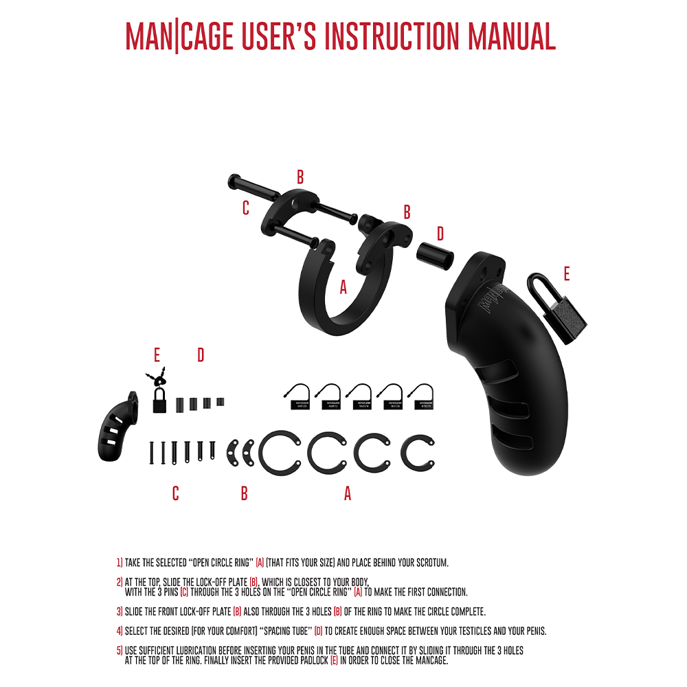 The Model 21 ManCage comes with 4 sizes of flexible scrotum rings, as well as a range of differently-sized spacers to get your perfect, inescapable fit, complete with 4 plastic locks that you can snip through with scissors when the time comes for release. The non-metal silicone and polycarbonate materials won't make any telltale clinking noises inside your clothes or trigger metal detectors, ensuring subtle wear wherever you go and that you never leave the confines of your cage until your partner shows you mercy! For playtime at home or in the dungeon, the sturdy metal padlock is perfect for more intense play and comes with a pair of keys (1 spare) to put the power in your lover's hands...