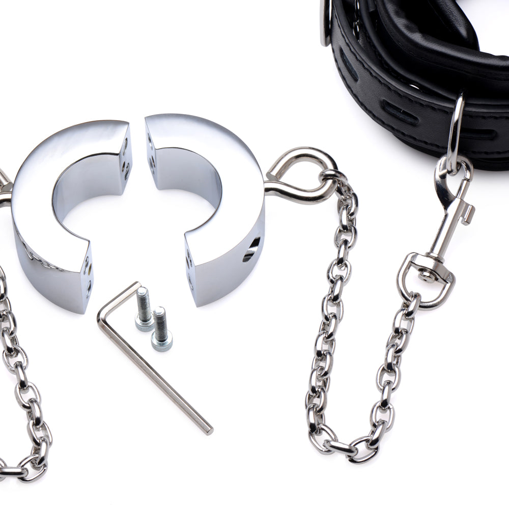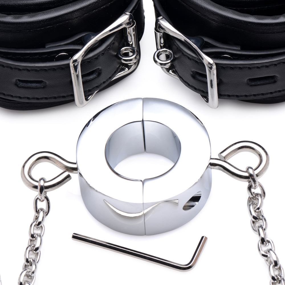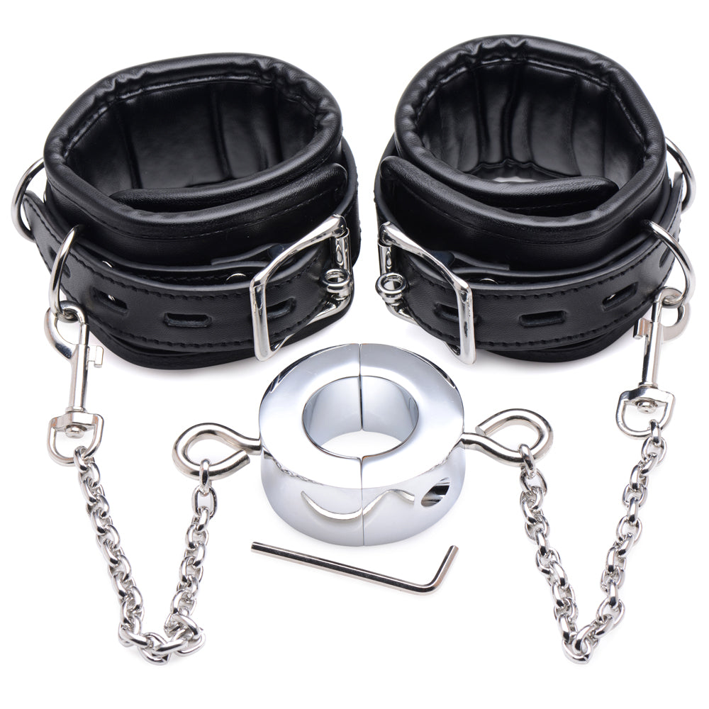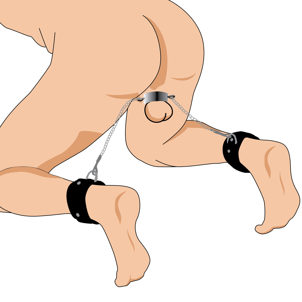 This kinky combo features a heavy metal ring that you can split open with the included Allen key to wrap it around your submissive's scrotum and stretch those balls. It's centred between 2 faux leather ankle cuffs that make it impossible for the wearer to straighten their knees or stand, keeping them firmly on their knees where they belong!