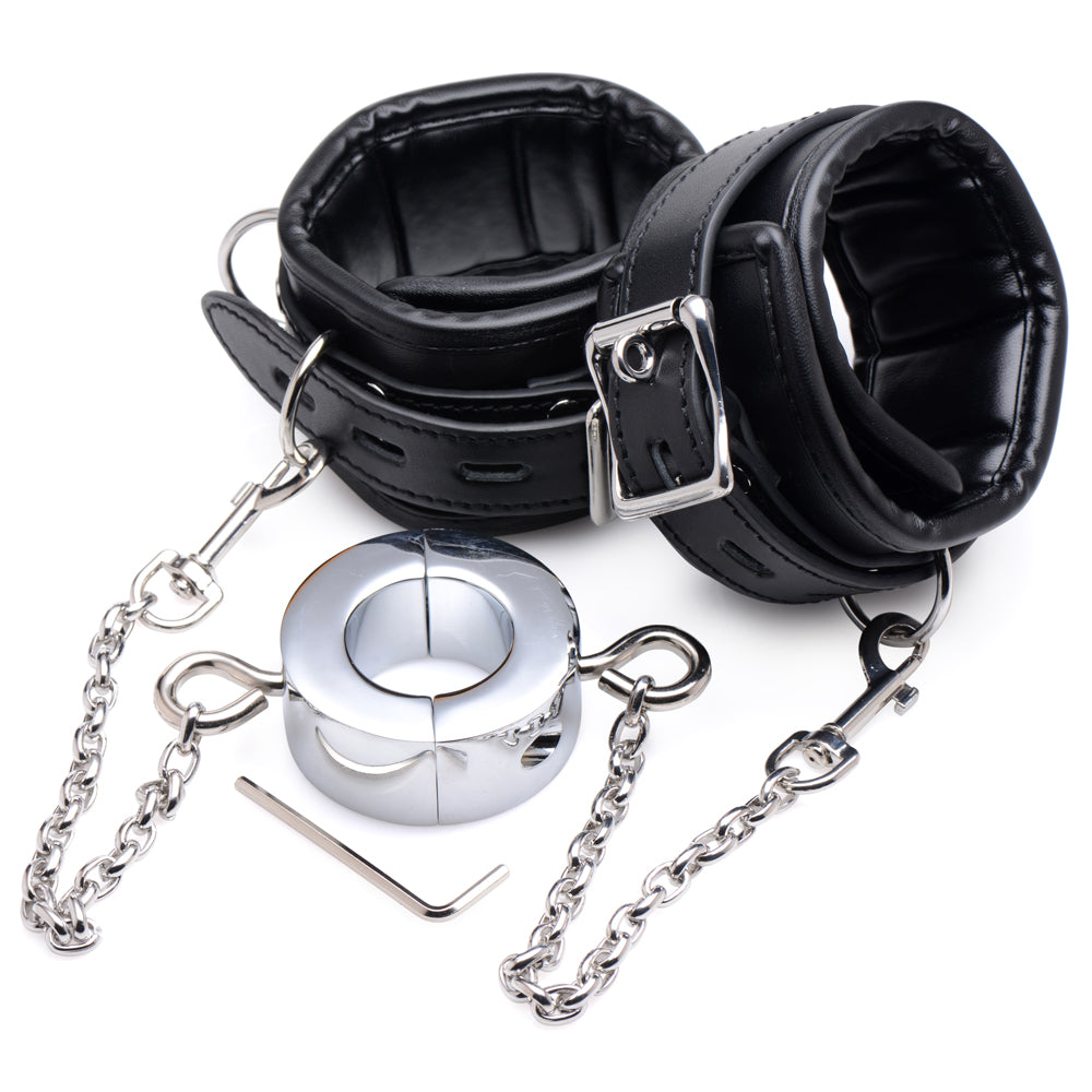 It's not all pain and torture though! The Master Series - Hells Tether Ball Stretcher Humbler cuffs are padded so the wearer is comfortable enough to fully enjoy their humiliation, and if you're feeling particularly cruel, the attachment points on the sides of the ball stretcher are perfect for attaching weights! If you're feeling extra-creative, the D-rings on the cuffs allow you to tie your sub down to other bondage furniture and accessories so you can make the most of his vulnerable position...