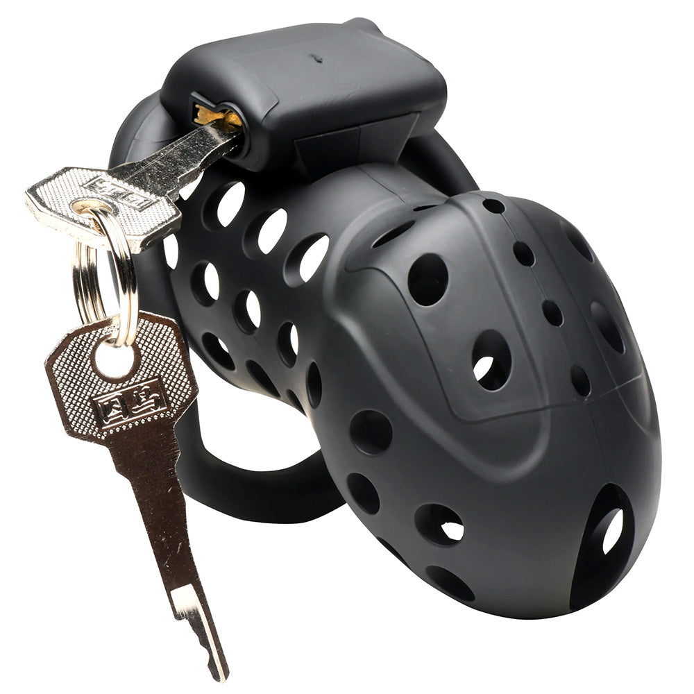 This chastity device is the perfect cock cage to keep him locked up in (relative) comfort for long periods thanks to its ventilated design that's highly breathable and the tip opening that allows for easy, comfortable urination without having to remove the cage. It also includes 4 differently-sized rings to achieve the most comfortable fit around the captive's penis so there's absolutely no excuse for wanting out before Master or Mistress says so!