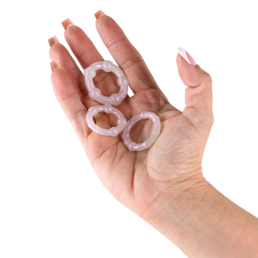 This triple-pack of cock rings is made from stretchy shimmer jelly and includes 3 different sizes to accommodate any wearer's penis size and can be worn one at a time or together for a more pronounced effect. The thick beads on each ring add extra stimulation and snugness around your shaft to keep more blood trapped in your erection, helping you stay harder for longer and go all night long...