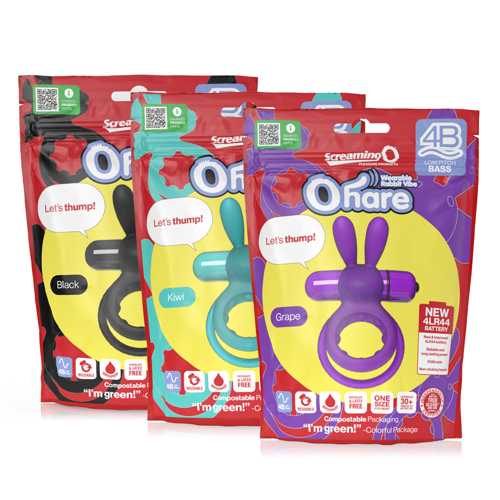 This buzzing bunny is the new and improved version of Screaming O's original bestseller cock ring, now with a deep 4B motor for low-pitched, whisper-quiet vibrations and an upgraded longer-lasting 4LR44 battery, all in compostable packaging. Just like before, it uses a stretchy silicone double-ring design to keep the toy in place, with one ring wrapping around the wearer's shaft and the other fitting over the testicles for a secure fit. The shaft ring features a series of raised nubs lining the interior for extra stimulation and also restricts blood flow away from the penis to help the wearer maintain a harder erection for longer. This also intensifies their orgasms for an ultra-explosive finish!
